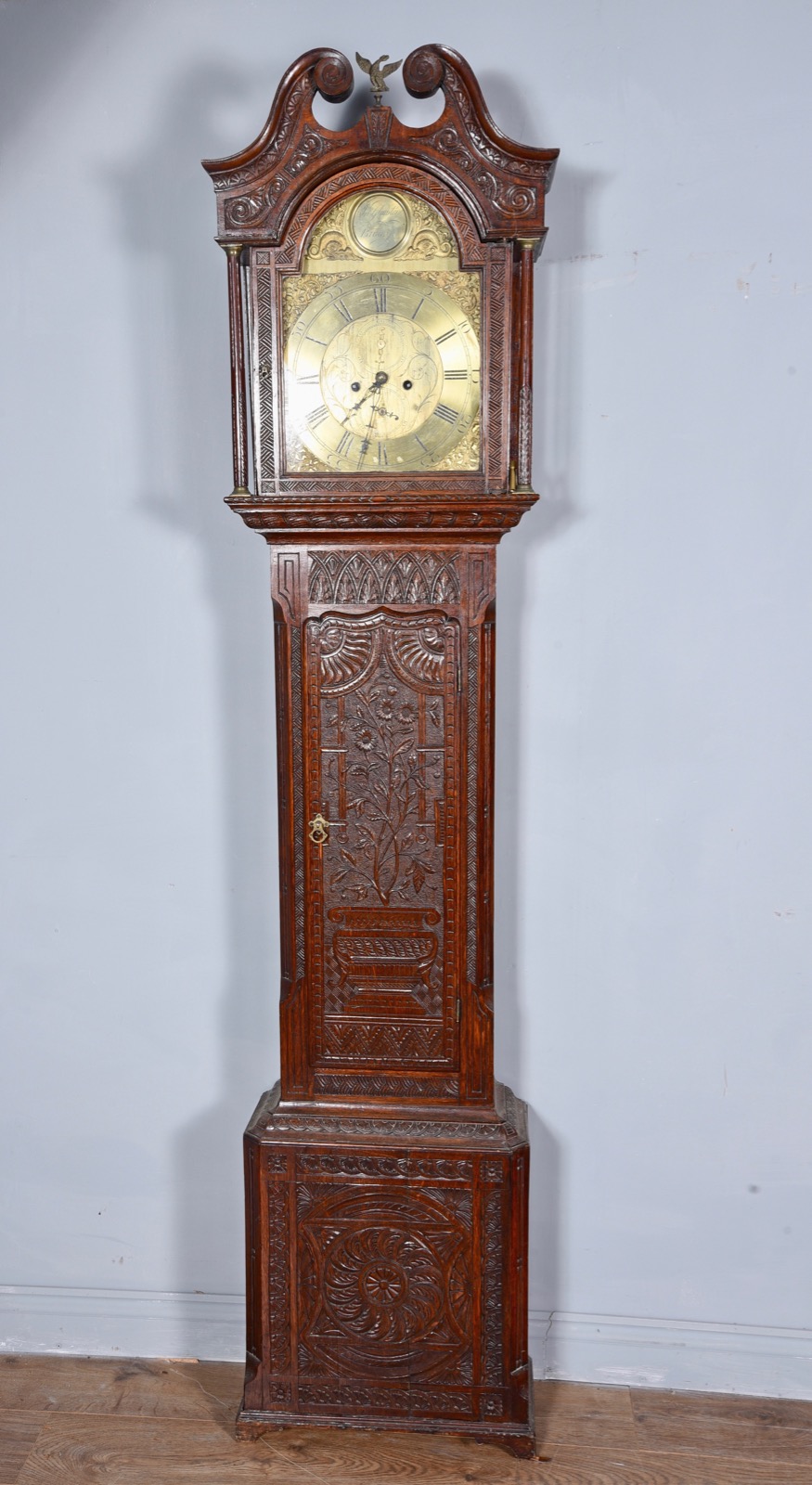 This is a fine quality late 18th century carved oak grandfather clock by John Gladstone of Biggar. The clock has a wonderful brass dial with serpent spandrels it has an eight day movement thats strikes upon a bell on the hour with hour count. It has been recently serviced and keeping good time.