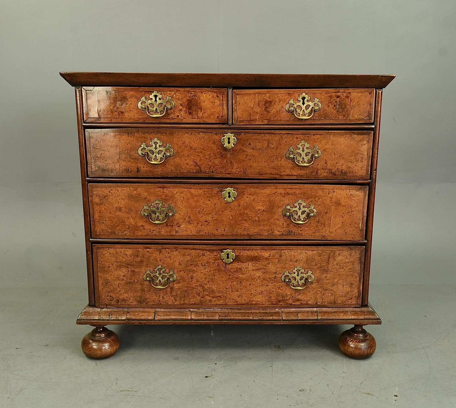 Good quality 18th Century 'Queen Anne style' burr walnut and elm chest of drawers that has wonderful proportions having a desirable depth. It has a fantastic colour and grain with a two over three configuration. The elm lined drawer are all solid in joint and slide nice and smooth as they should. The chest stands on wonderful turned bun feet.