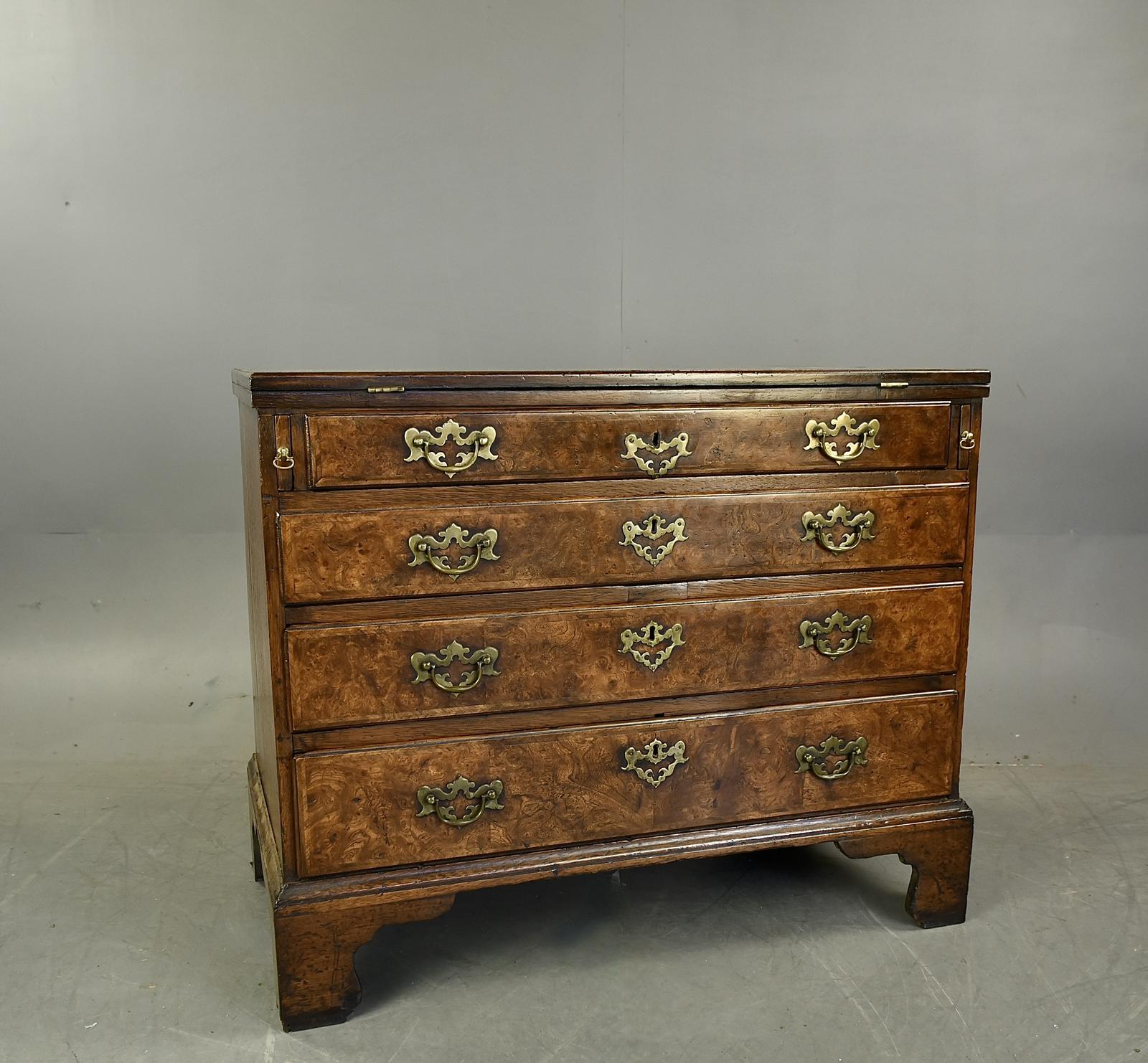 Fine quality mid 18th century burr walnut bachelors chest of drawers. This fine chest has been fully restored to a high standard with some replacements. It has an unusual useful 2/3 rd flip top with 1/3 fixed section. The oak lined drawers all run smooth as they should with the top drawer with compartments. It has a wonderful colour and grain and stand on original bracket feet. It has wonderful burl top and drawer fronts with feather banding, the sides are solid oak, very well proportioned. There is a date carved to the under side of 1759 and a W.