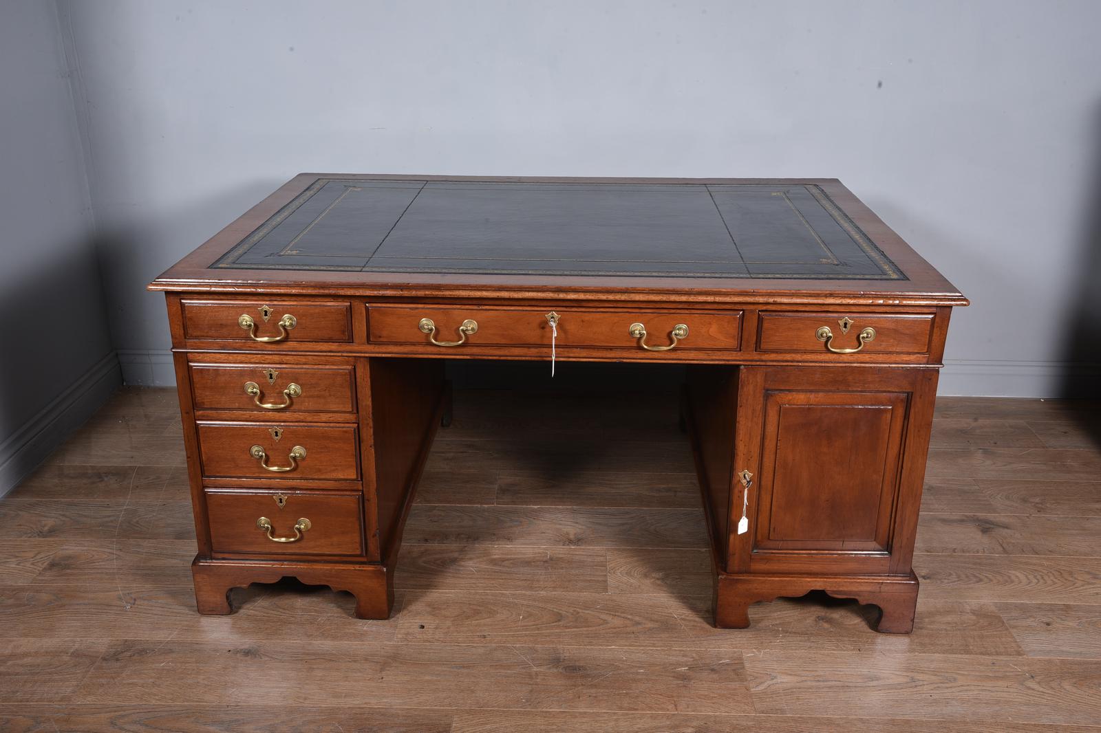 Good quality late 19th century Georgian style true partners desk which has three drawers to the top with each pedestal having three drawers and cupboard on opposing side. the arrangement can as photographed with drawers to the left and cupboard to the right or can be arranged with drawers to the front and cupboards to the back a very versatile desk and of a good working size. There are keys for both cupboards and a single key that works the central top drawers. The desk has had a new black leather insert with gold and blind tooling.