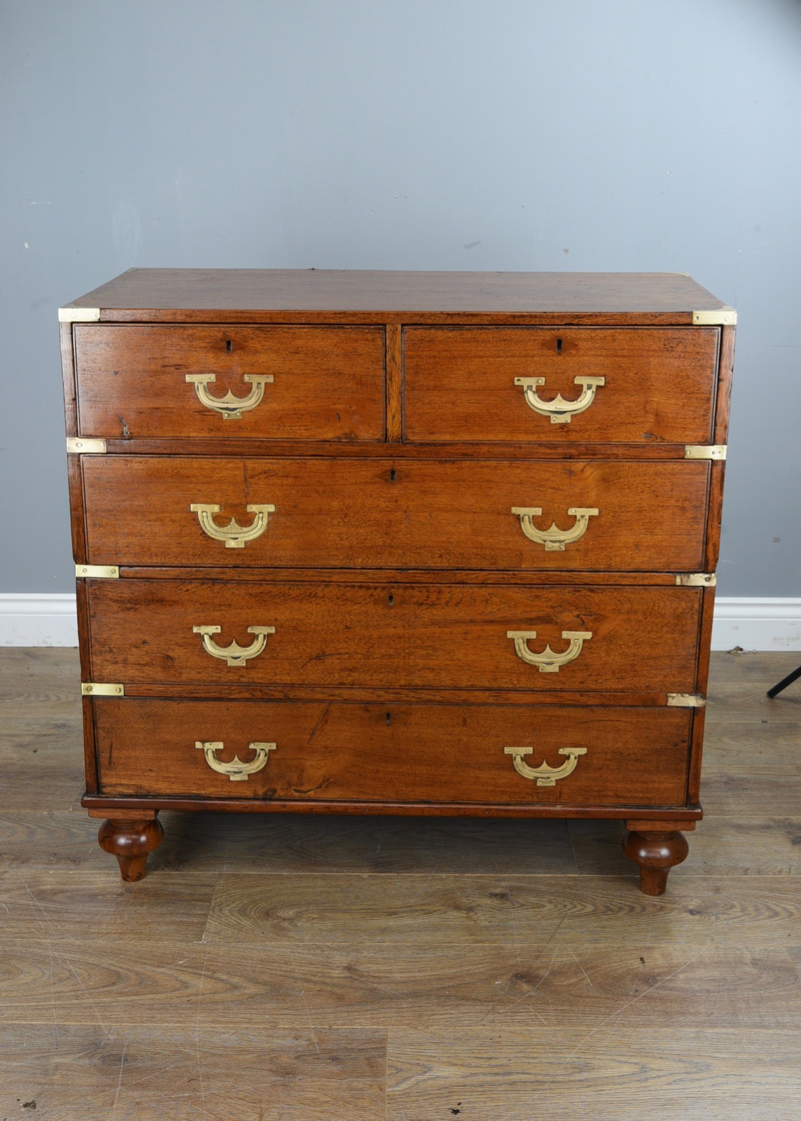 This is a fine quality 19th Century antique campaign chest of drawers of medium proportions in very good condition and great colour. The chest splits in two sections typical of campaign chests. The real lined drawers are all solid and slide nice and smooth as they should.