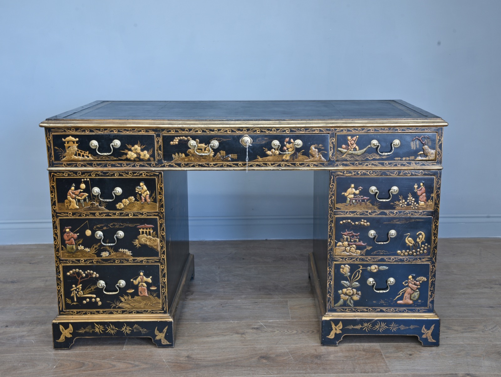 Fine Quality black chinoiserie pedestal desk circa 1920s very decorative in very good condition with a new black leather writing insert with gold tooling .The desk is also decorated to the back enabling it to be free standing if required. The centre drawer is complete with working lock and key.