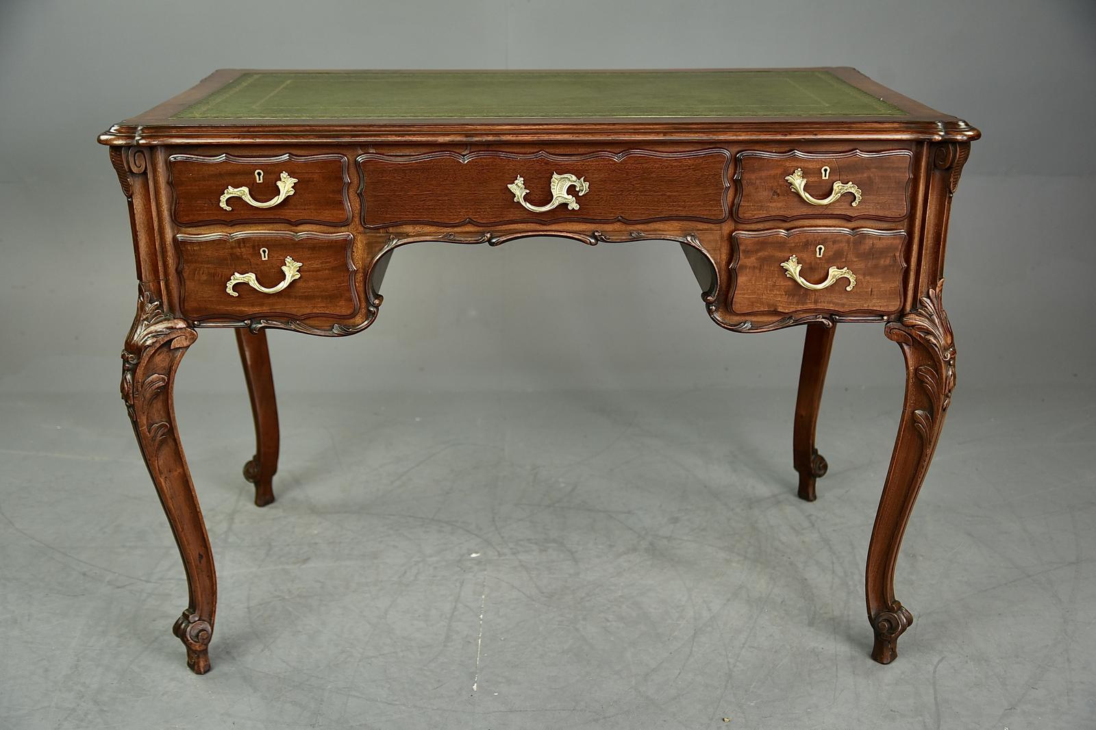 Fine quality late 19th Century French Rococo antique mahogany writing table / writing desk which has quality carved cabriole legs with ornate brass ormolu handles. All drawers slide nice and smooth as they should with original locks (no keys). The desk has had a quality new leather insert with gold tooling.