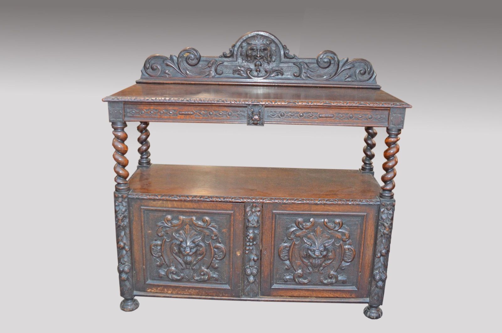 This is a fine quality large antique carved oak green man buffet. The buffet has fine deep hand carved detail and a wonderful antique patina. It is in great condition with two drawers to the top and cupboards below.