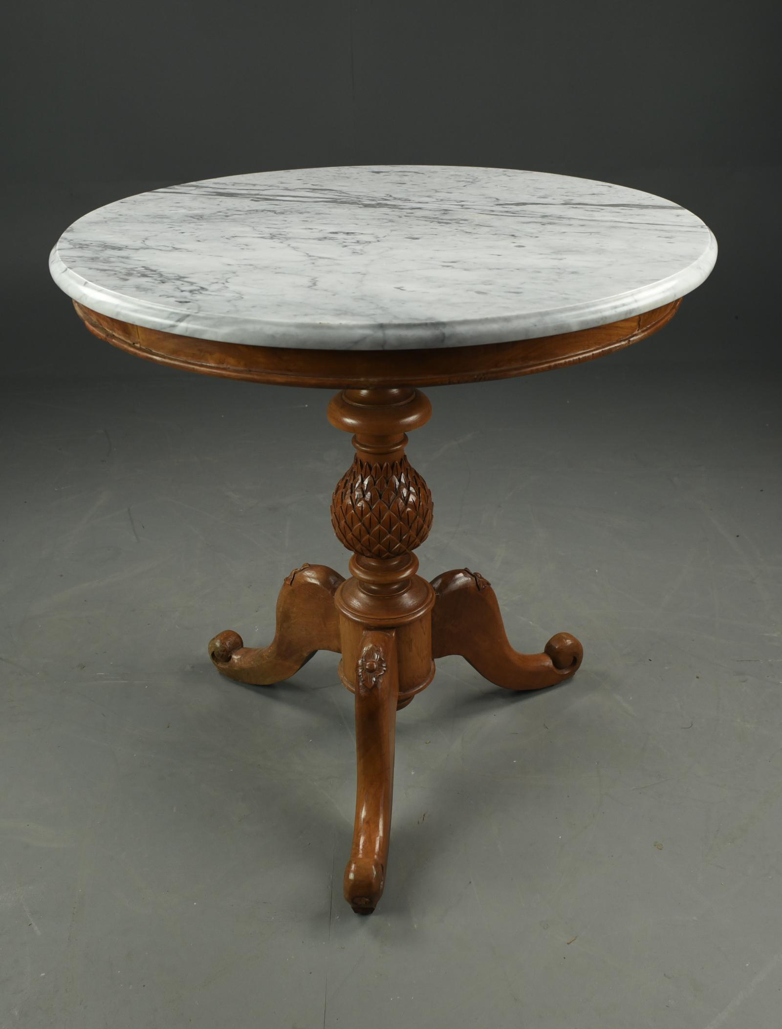 Good quality marble top centre table with carved pineapple walnut base circa 1920 in great condition with no cracks or chips in the marble, stands nice and solid as it should.