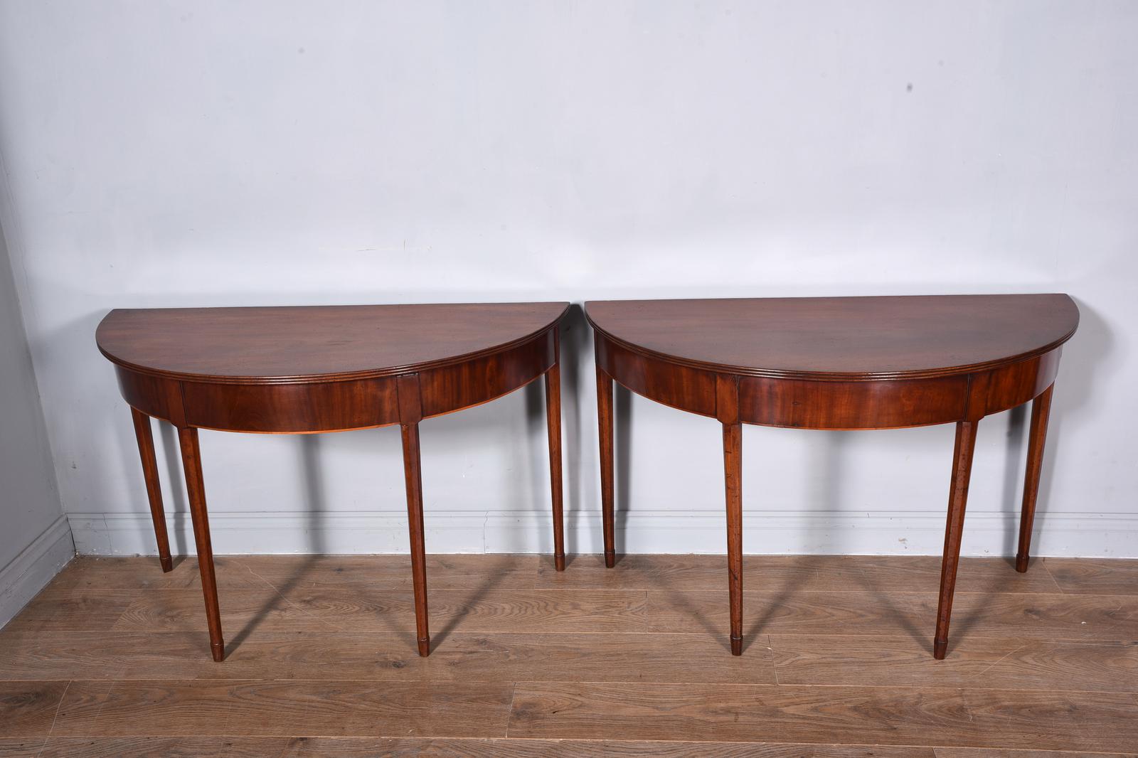 Fine pair of Georgian mahogany Demi lune console tables constructed of solid mahogany through out with unusual hexagon tapered legs .
