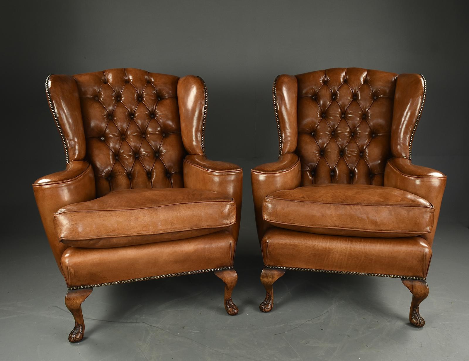 Stunning pair of antique leather wing chairs that have been fully refurbished to a very high standard. The leather is soft and supple and has been traditionally hand dyed in a wonderful cognac colour with fine patina .they are very comfortable being a good size with great proportions.