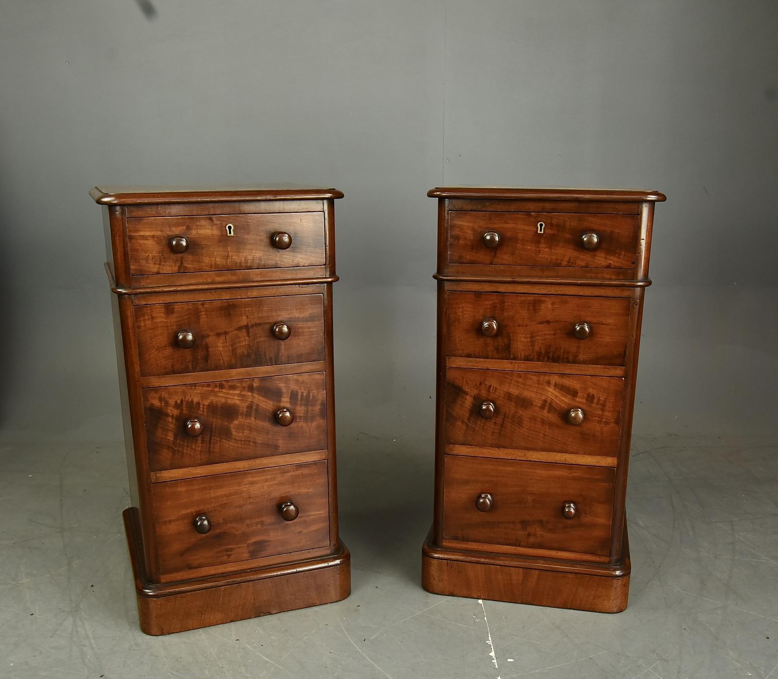 Fine quality pair of mid 19th Century Victorian antique mahogany bedside chests of drawers. Both chest are in great condition with a wonderful colour and grain. Each chest has a solid mahogany top that have no splits or unsightly ring marks. They each have graduating drawers that are solid mahogany lined with fine hand dovetail joints. They all slide nice and smooth as they should. There is a single key that locks the top drawer in each chest. They are a very good size with good proportions.