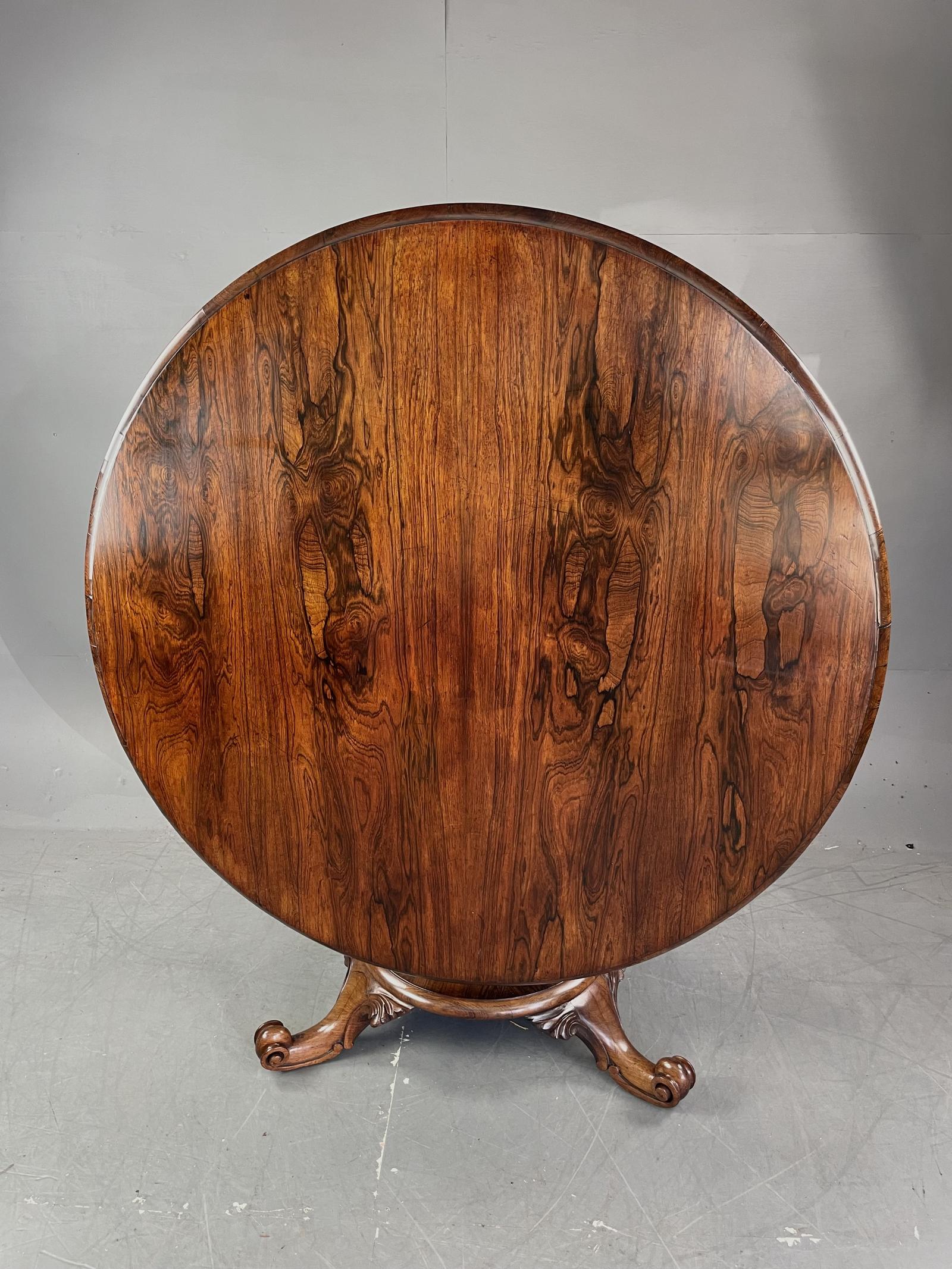 Fine quality 19th Century William IV antique rosewood dining table has a fantastic grain and colour and is in great condition. The wonderful curcular top has a tilt action and stands on a fantastic triform base with outstanding hand carved scroll feet. It stands very solid with no wobbles and will seat 6 comfortably with a 130cm diameter top.