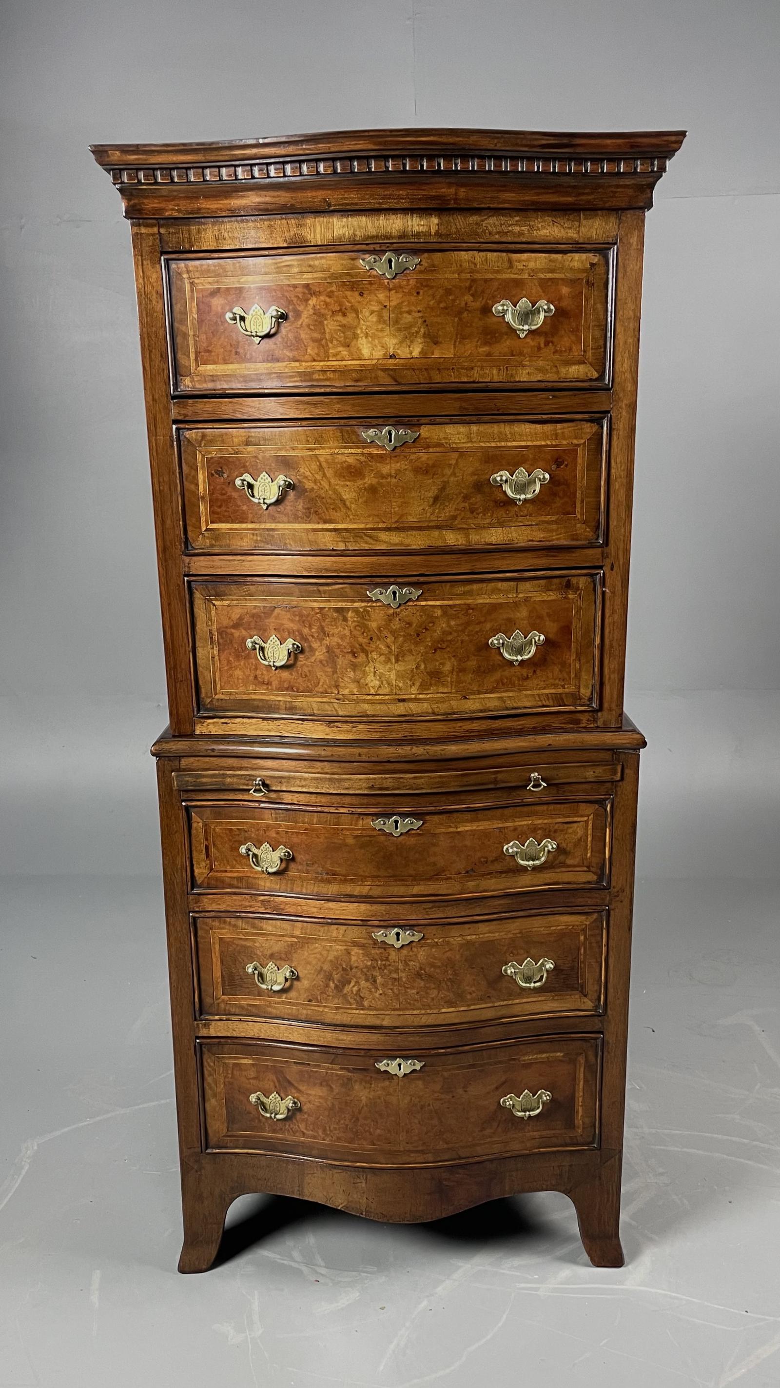 A fine quality small walnut serpentine chest on chest with brushing slide circa 1900.