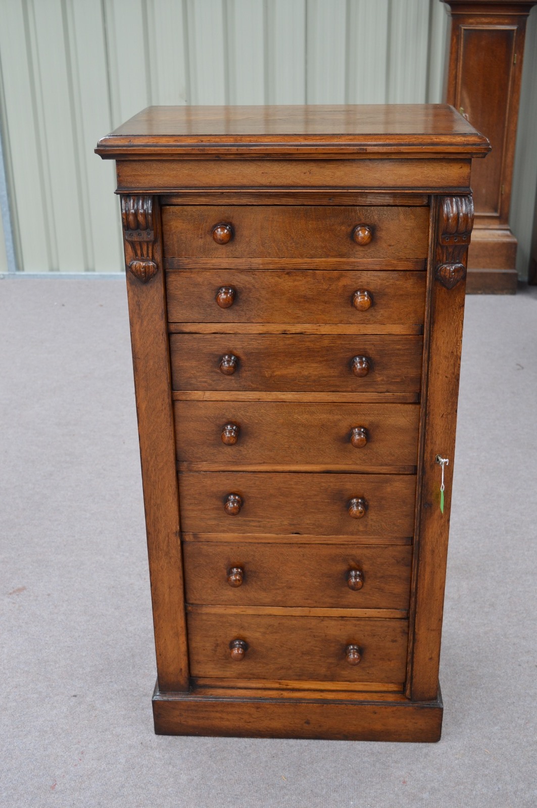 Fine mid Victorian antique oak 7 drawer Wellington chest which has 7 graduating drawers that are all hand dovetailed and slide nice and smooth as they should with side locking and working lock and key.