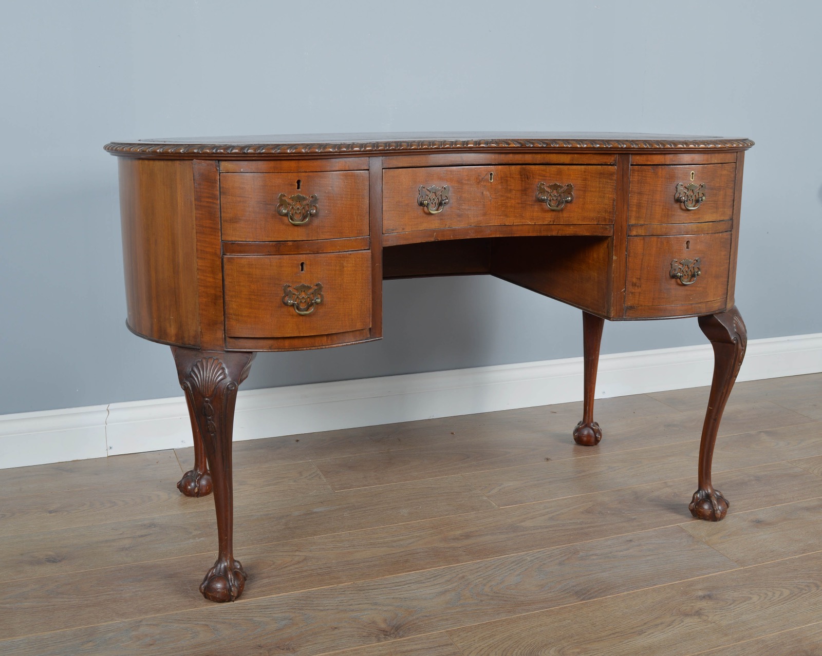 This is a good Edwardian antique walnut kidney style desk in great condition with wonderful distressed leather insert and fine hand carved claw and ball legs. It is damage free and woodworm free. All drawers slide nice and smooth as they should with hand cut dovetail joints and mahogany linings.