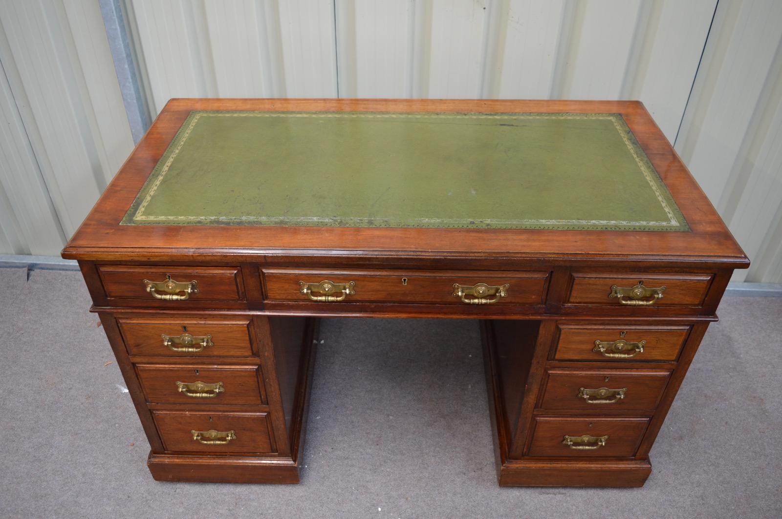 This is a fine Edwardian antique walnut pedestal desk which has nine very useful drawers with a leather leather insert. It comes in three sections for transport and stands on original hidden castors all drawers slide nice and smooth as they should.