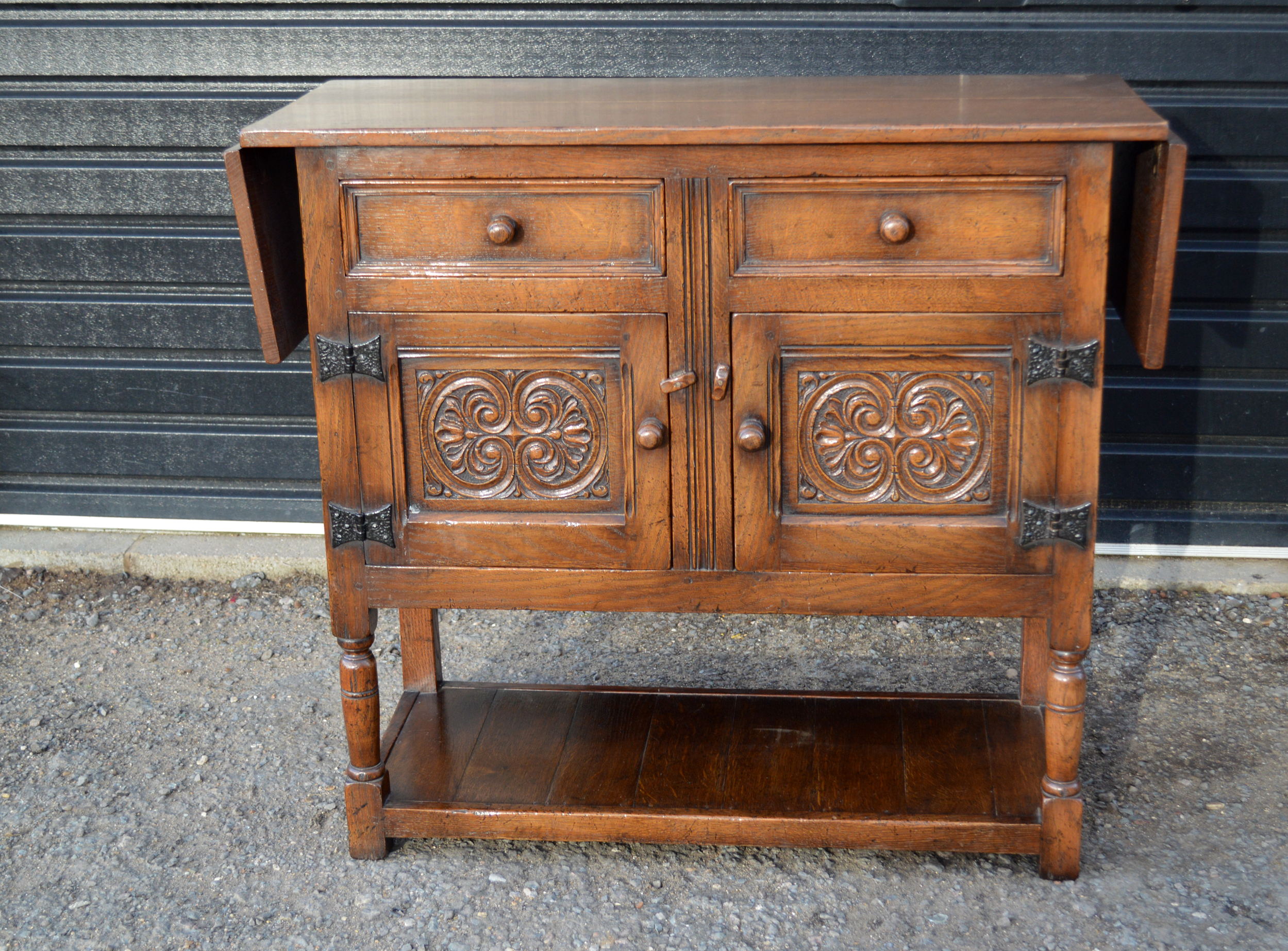 On offer for sale is this very good quality carved Ipswich oak drop flap sideboard serving table or hall table. This really is top drawer with the finest hand carved oak panels to doors hand forged steel hinges hand dovetail jointed drawers and has been hand finished to the highest standards giving it a unique finish that really set this off against inferior quality mass produced furniture.