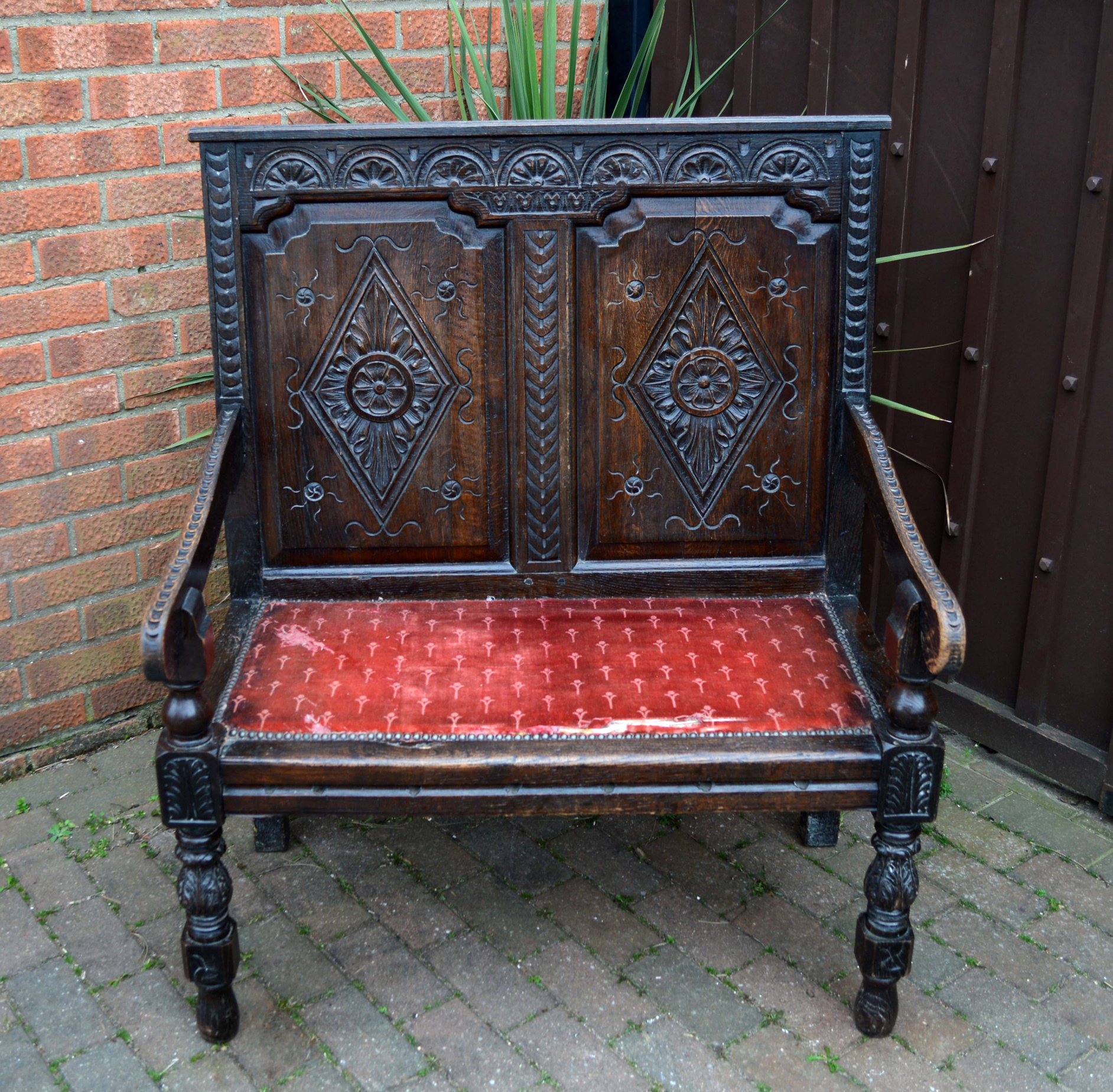 On offer for is this fine quality early 19th century small two seat carved oak settle ,the settle is in great condition and has a wonderful period oak patina all the carvings are nice and crisp and of the highest standard , It is in great condition for age no woodworm past or present .