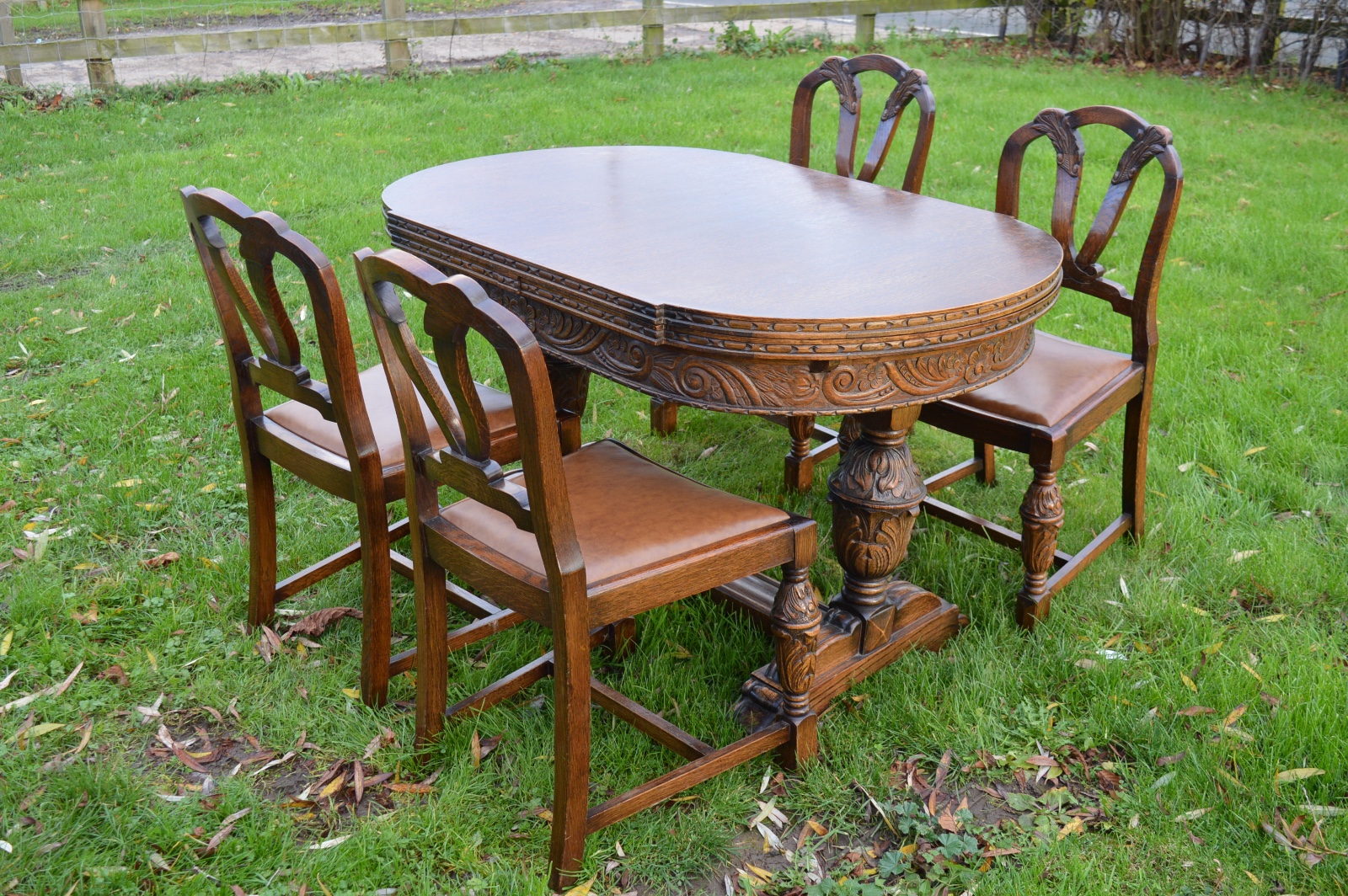 On offer for sale is this very good quality original Rare 1920s carved oak dining suite. The suite is beautifully carved oak of the highest quality and is all original. These suite very seldom come onto the market these days complete. The dining table is extendable with to pull out leaves it is the rare desirable D end shape it has 4 matching chairs and a fantastic matching sideboard that is nicely fitted inside.