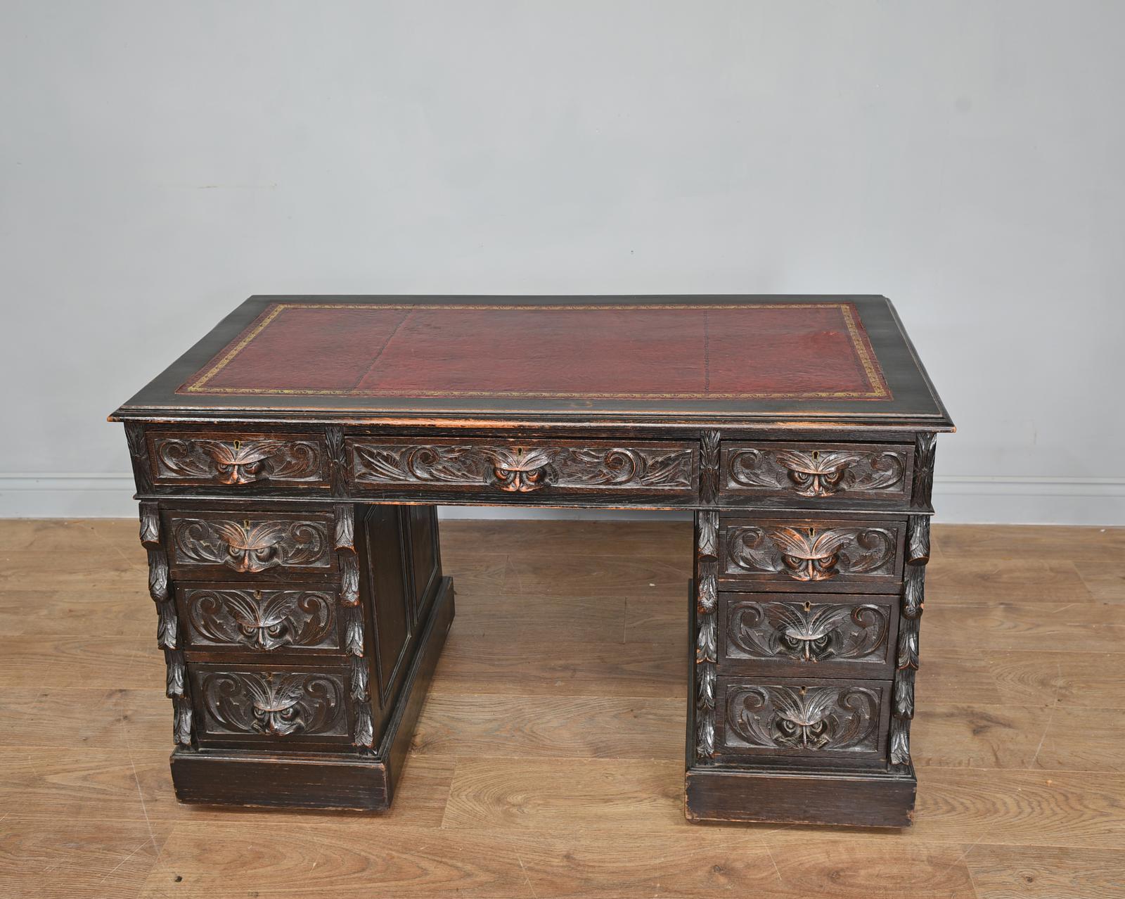 The desk is in great condition with a wonderful original patina with all the character marks and patina an Antique should have .the desk has nine drawers in total that all slide nice and smooth as they should , The top has a dark maroon leather insert with gold tooling