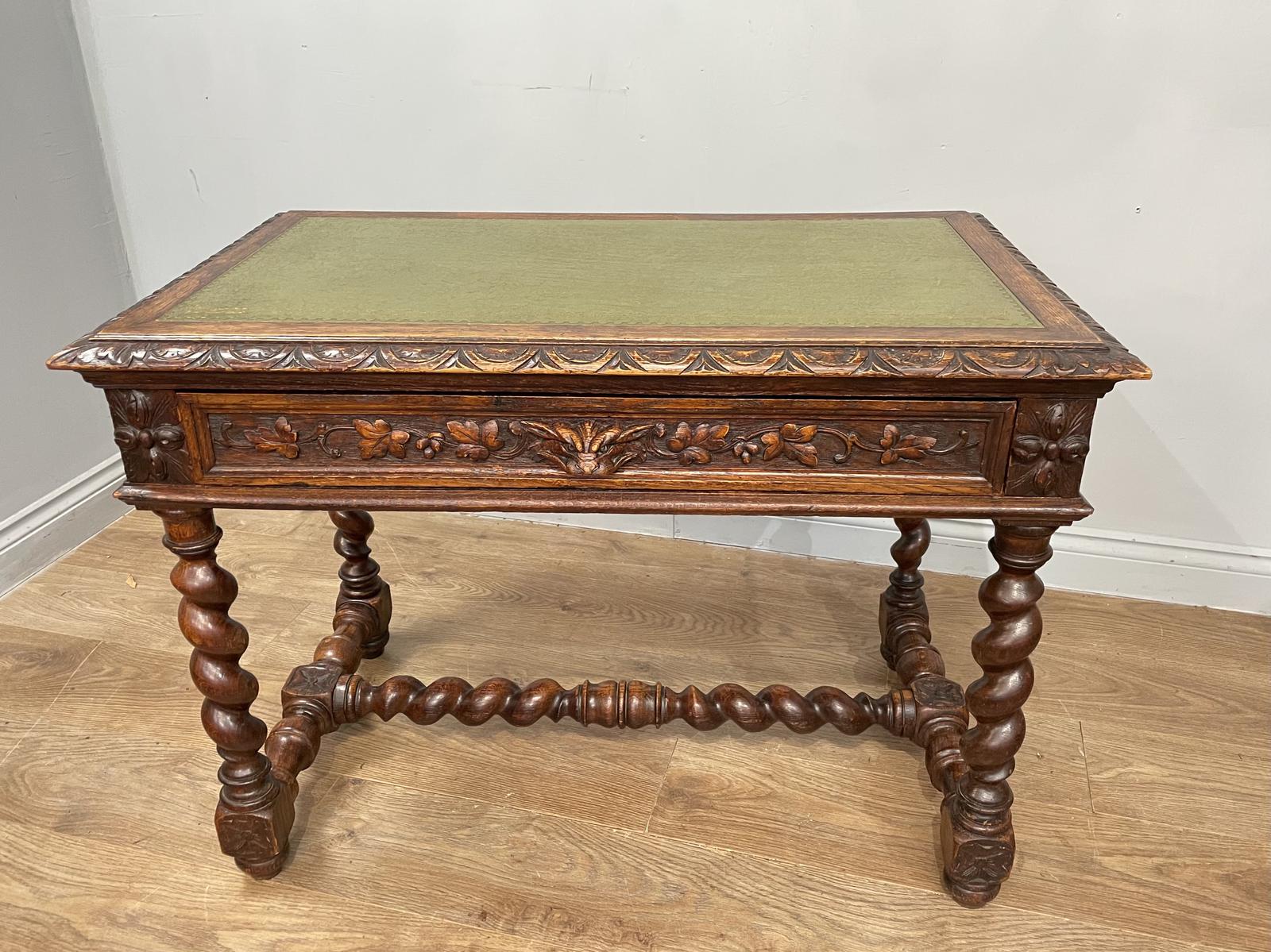 Fine Quality late Victorian carved oak Green man leather top Desk in very good clean condition free from wood worm stands very sturdy with no loose joints .