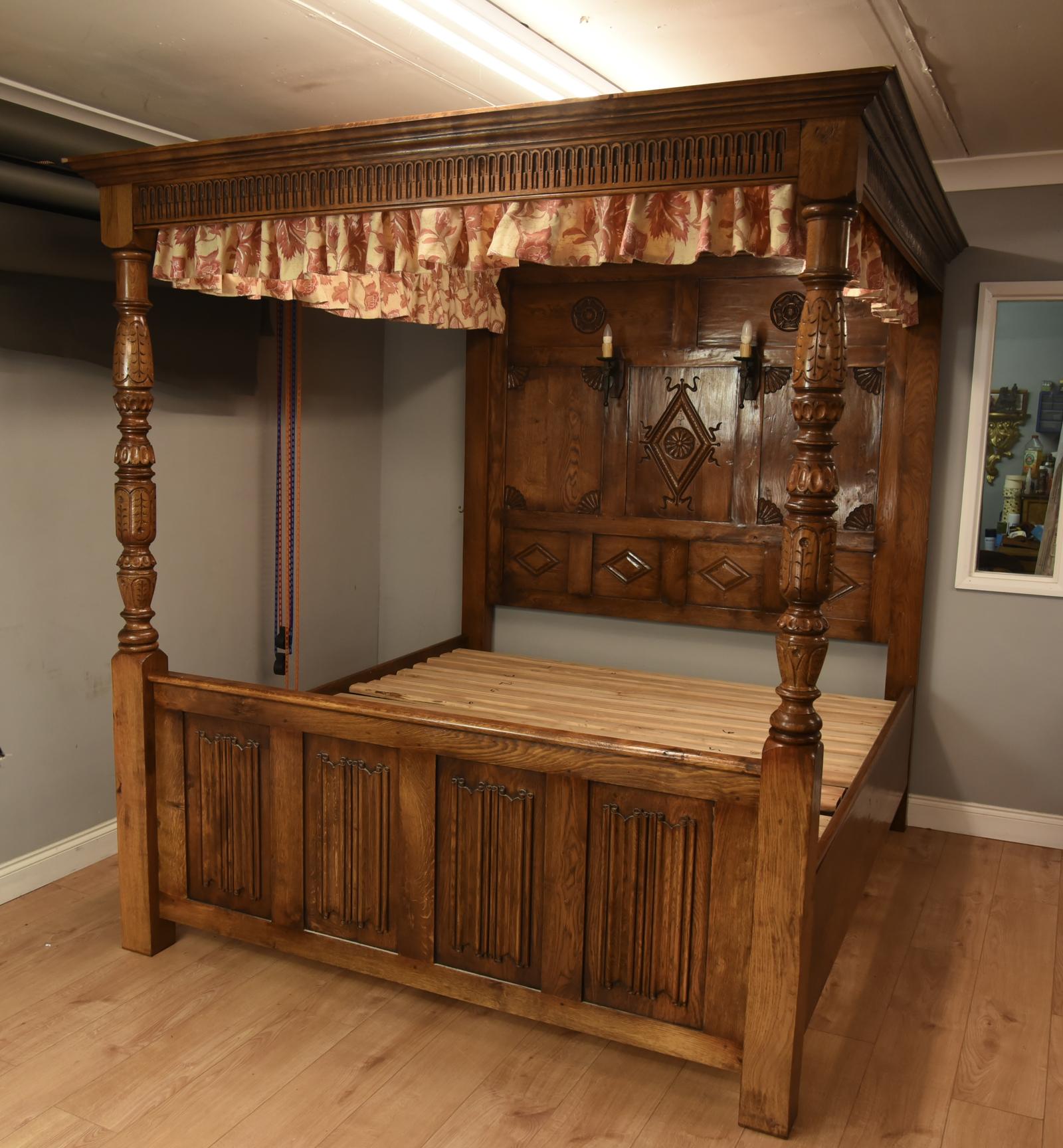 Fine Quality hand made solid English oak Tudor style carved oak super king size four poster bed. The bed is constructed of the finest solid English oak that has been hand carved to the highest standard. it has been finished in the traditional way by hand to give a true period finish and a fantastic rich oak colour.