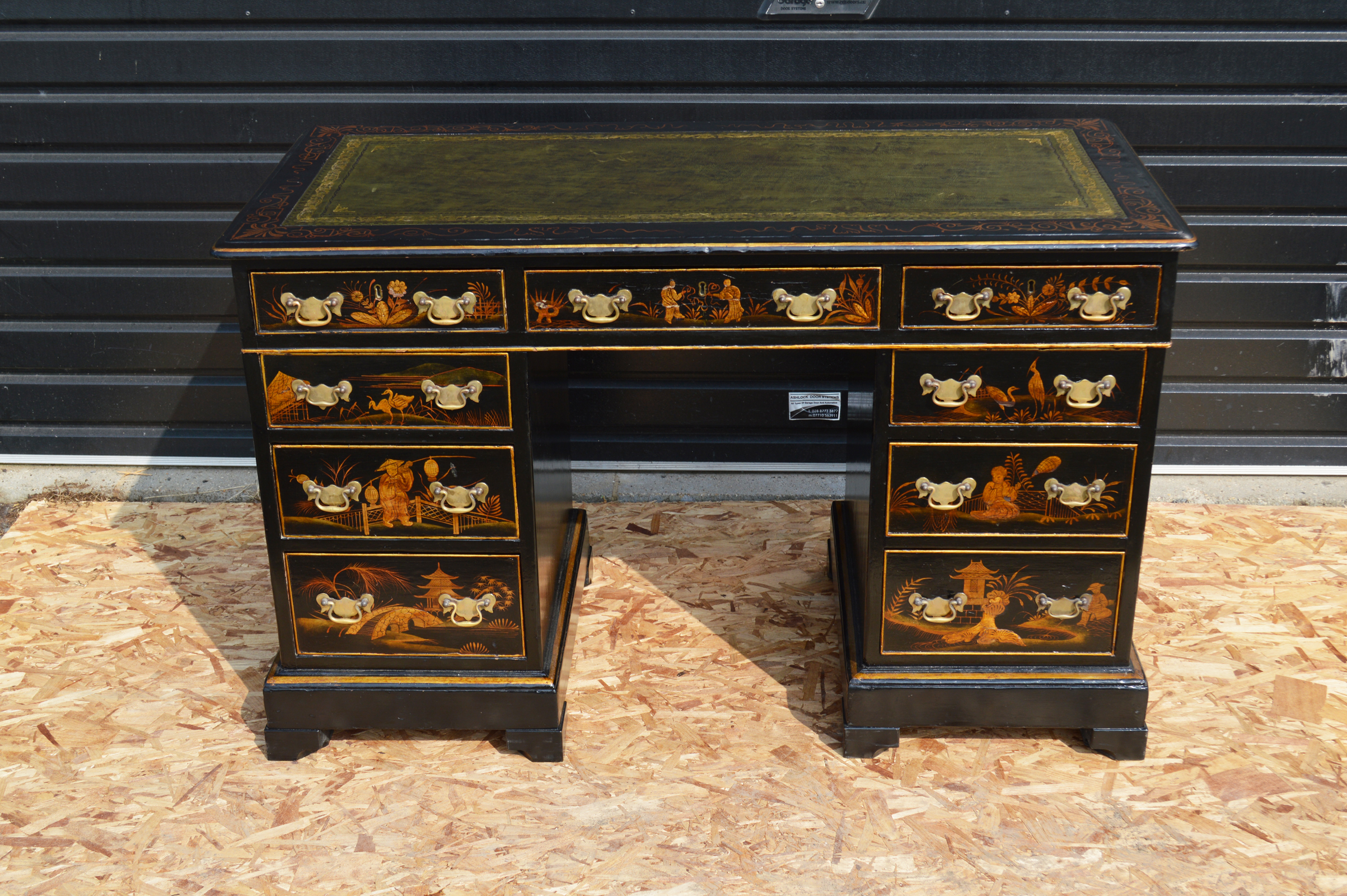 On offer for sale s this wonderful Victorian chinoiserie leather top pedestal desk .