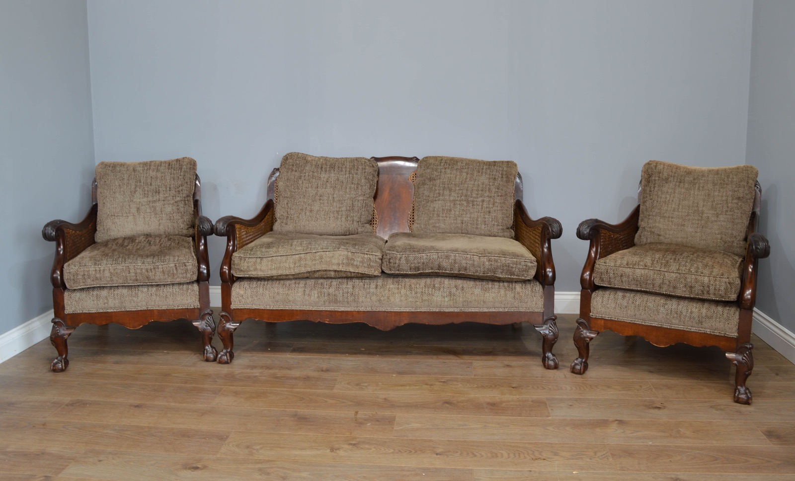 Fine Edwardian mahogany bergere 3 piece suite. The suite is constructed of solid mahogany through out and has the desirable double cane sides, all the cane work is in great original condition with no damage. The upholstery is a little worn but is very clean from a smoke and pet free home.
