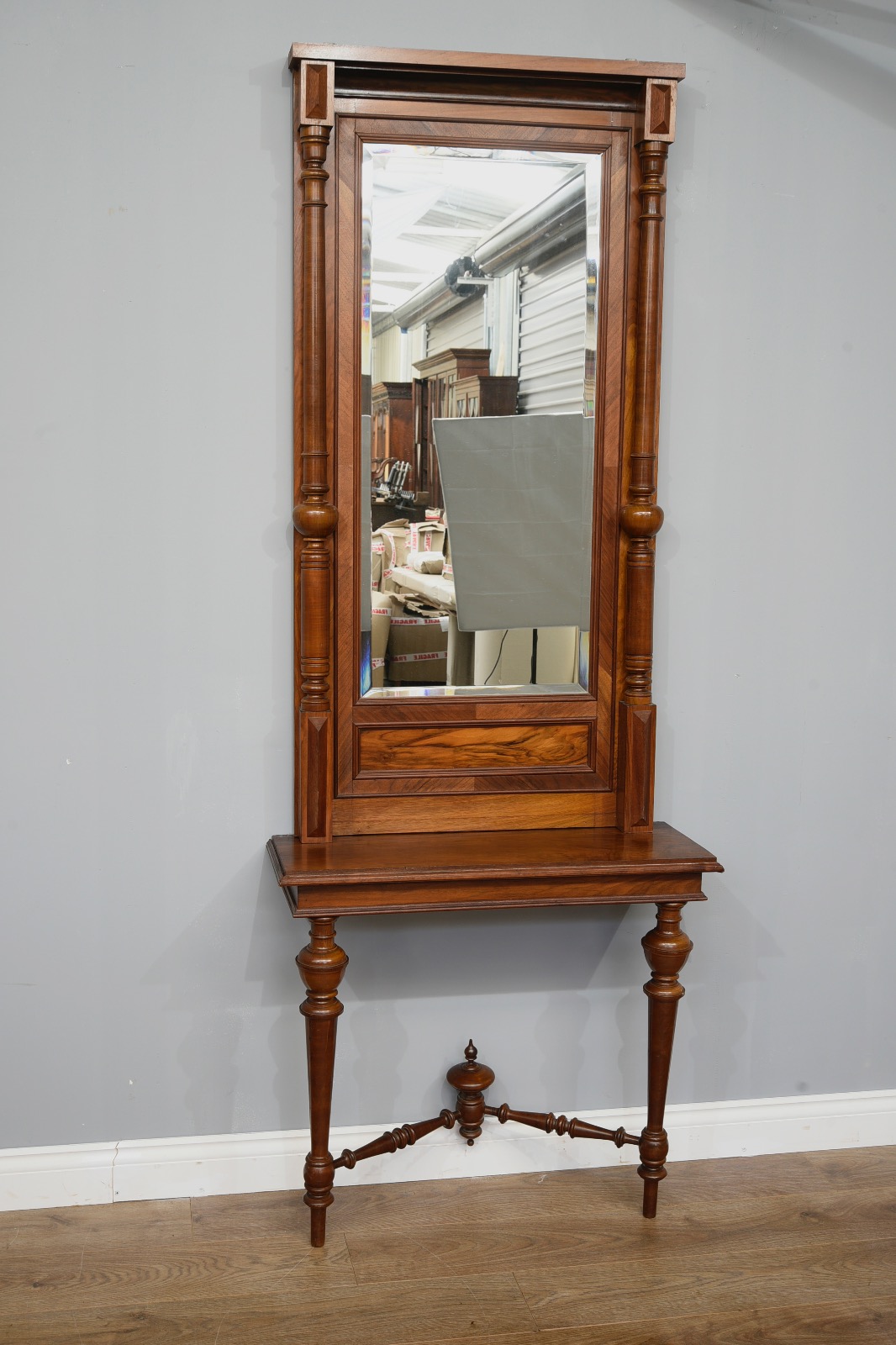 both are in great condition the console table has wonderful turned solid walnut legs with a ornate stretcher base the mirror again has a wonderful walnut frame with original bevel edged mirror again in great condition ,
