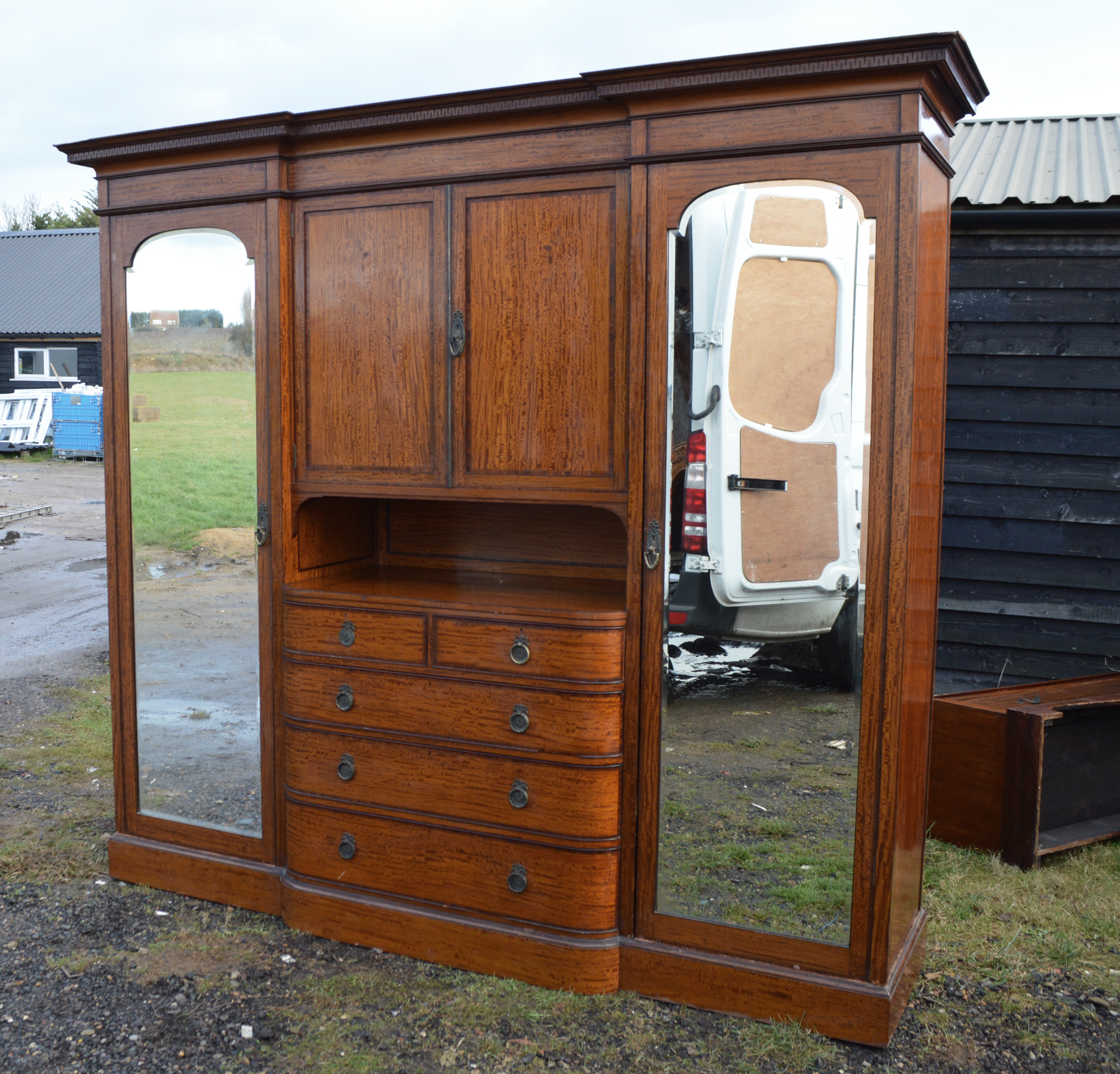 On offer for sale is this very good quality large Edwardian satinwood triple wardrobe compactum. The wardrobe is of the highest quality as all satinwood furniture as it was a very expensive material in the late Victorian, Edwardian times. The wardrobe has a wonderful regency style bow ended chest of drawer centre with open cubby hole above with a fully fitted cupboard above with three slide out trays. It retains its original beveled mirrors to the doors with hanging rails and shoe boxes below.