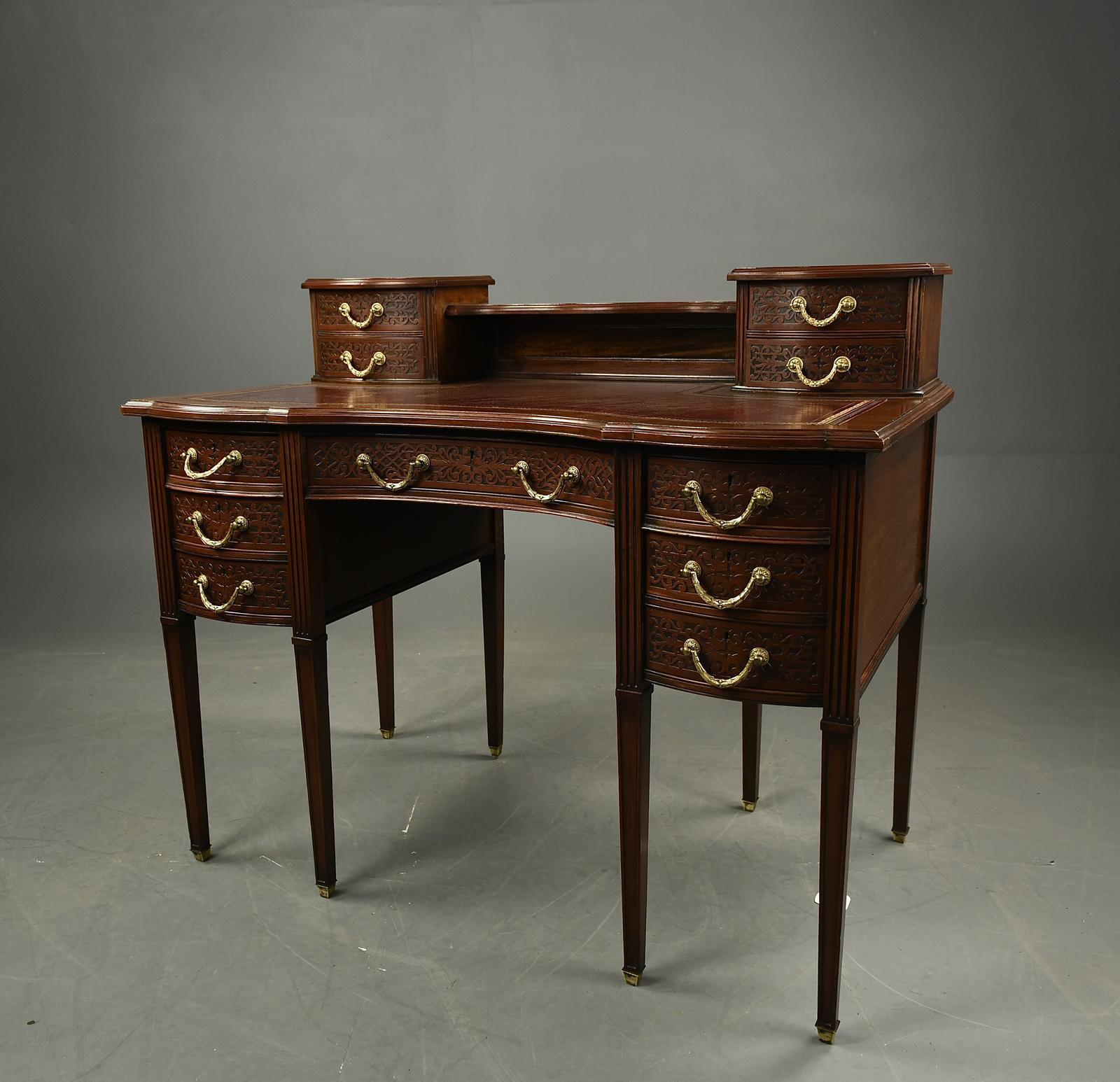 This is a fine quality Edwards & Roberts mahogany Ladies writing desk which is in very good condition and is of the highest quality made by one of the best English cabinet makers. It has blind fretwork drawers and fine quality brass swan neck handles. All the legs terminate in brass caps .with a quality leather writing insert.