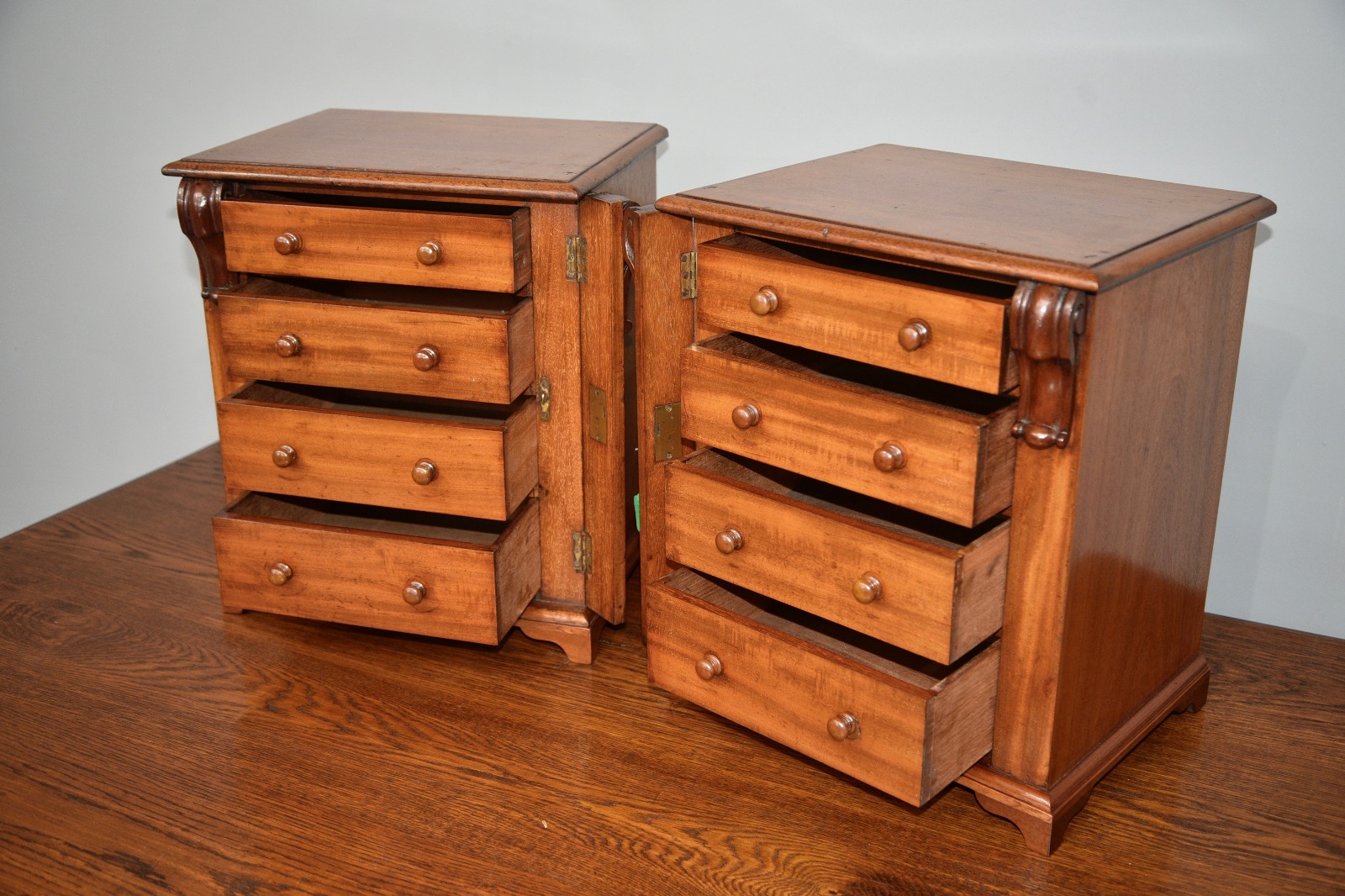 Fine Quality rare pair of small early Victorian wellington collectors chests possibly early cabinet makers samples or apprentice pieces, both have 4 drawers with typical side locking bar with a single key for both.