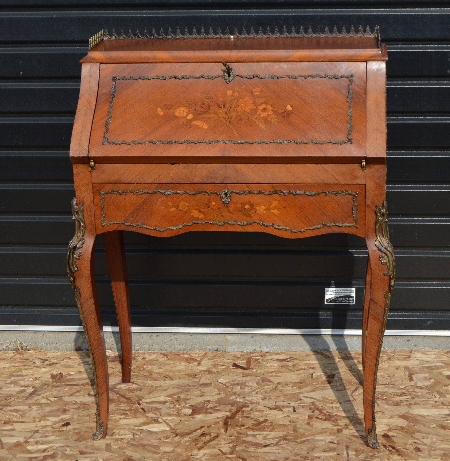 It is in very good condition with fine inlaid details and brass gallery and mounts . the bureau retains a single key that fits the fall front lock and drawer lock .