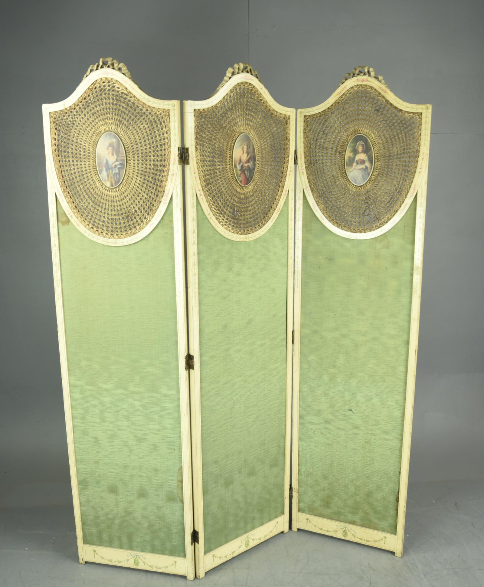 Decorative painted three fold screen with shield shape caned panels each with hand painted oval portraits of ladies in period costume The tops with fine carved ribbon with the screen is all original showing some marks to the fabric. It has had two replacement hinges at some point.