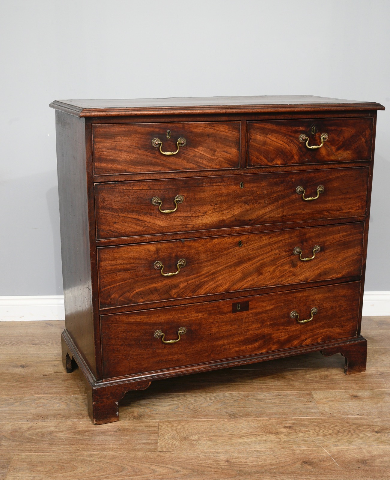 Fine Quality Georgian mahogany chest of drawers consisting of two small over three wide drawers in very good condition with brass plate handles. The drawers are all oak lined with fine hand cut dovetail joints. All drawers run nice and smooth as they should and the chest of drawers is woodworm free.