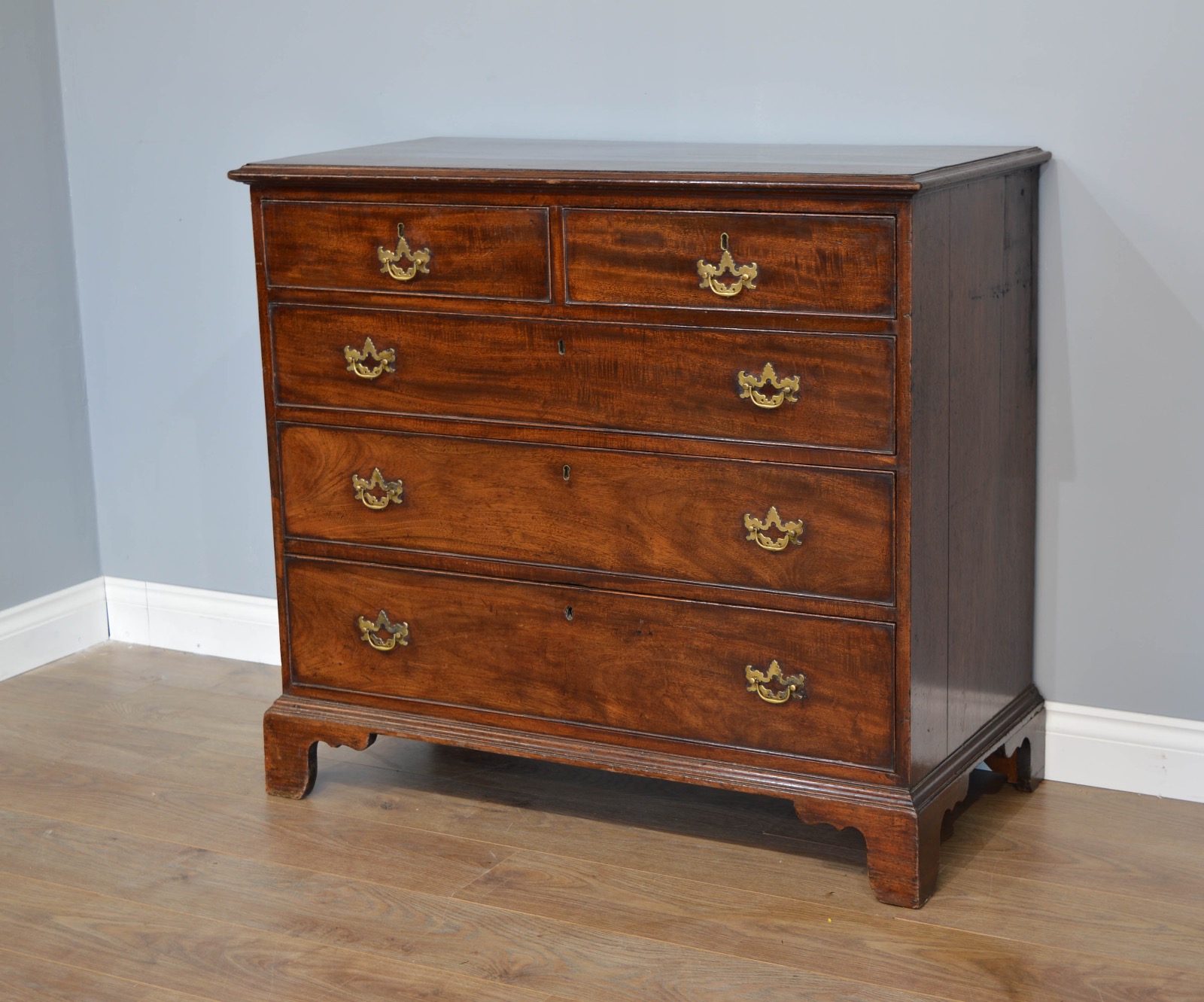 Fine Quality Georgian mahogany chest of drawers which has a wonderful patina and a good mahogany grain with period brass plate handle and oak lined drawers. The chest is in wonderful condition considering its great age. All the drawers are solid and slide nice and smooth as they should.