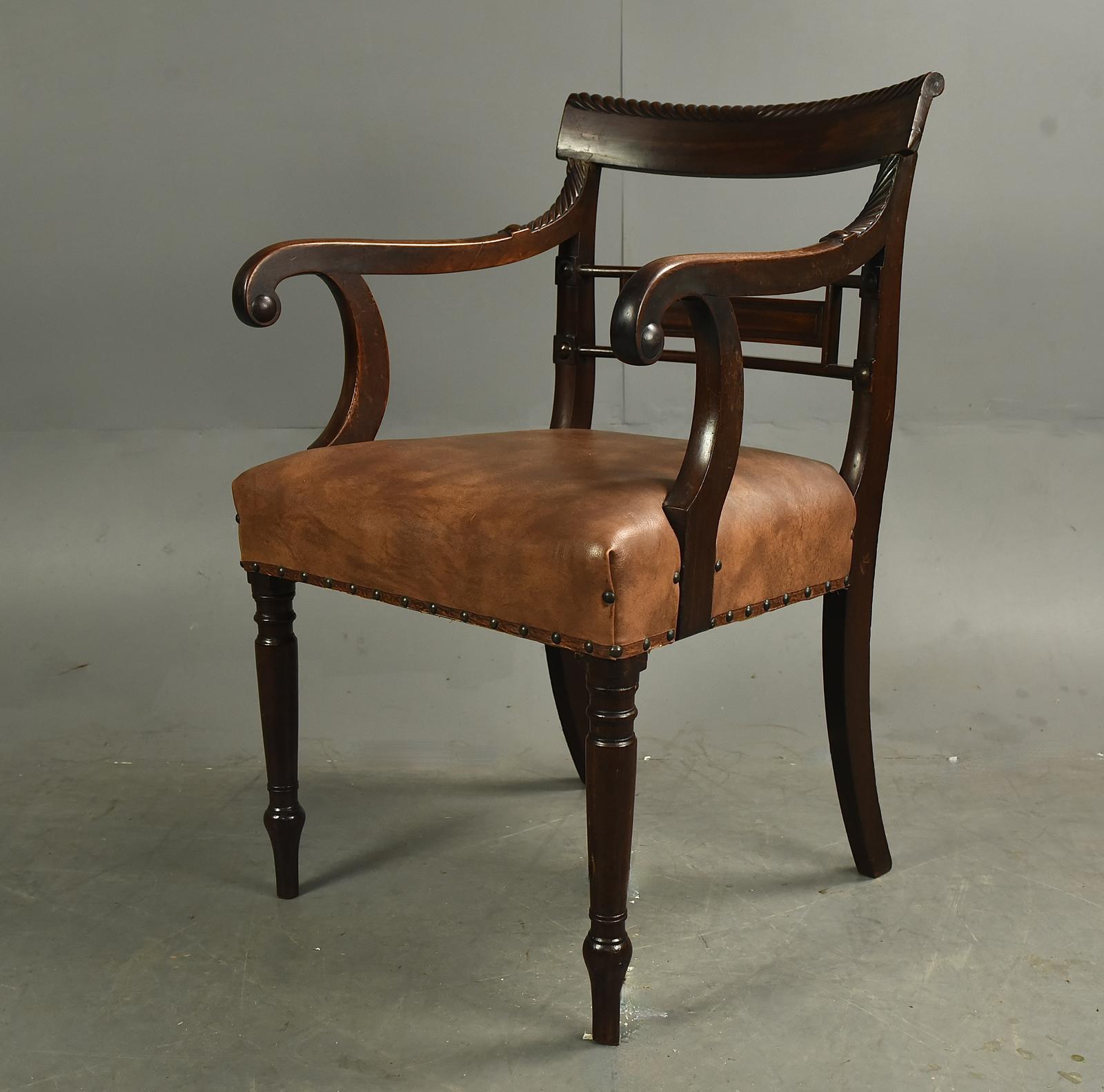 Fine quality early 19th Century (c.1800) Georgian antique mahogany desk chair / armchair is very solid with rope carved back splat and scroll arms stand on turned front legs. It is constructed of solid mahogany through out. The chair is a good weight and comfortable to sit on.