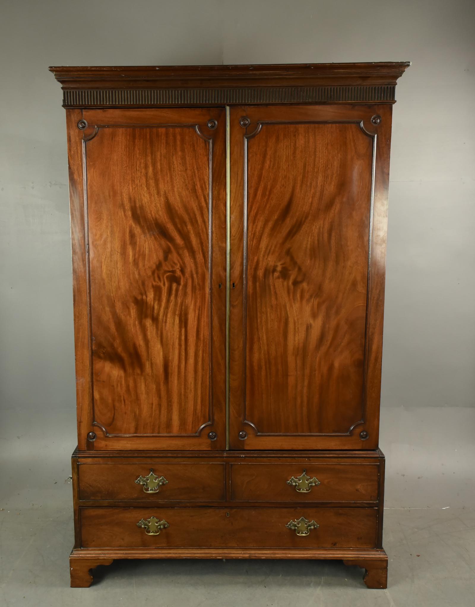 Fine quality 18th Century (c.1780) Georgian antique mahogany two door wardrobe which has a wonderful colour and is well figured. The interior has a single hanging rail and fixed hooks to three sides. It has original fabric lining .the base has a single drawer.