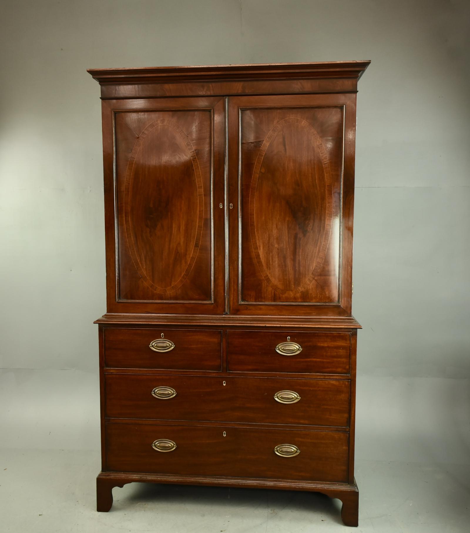 The top cornice has a moulded edge and beautiful flame mahogany frieze and sits above two cross banded and oval inlaid panelled flame mahogany doors with moulded mahogany closing strip. Complete with working lock and key.