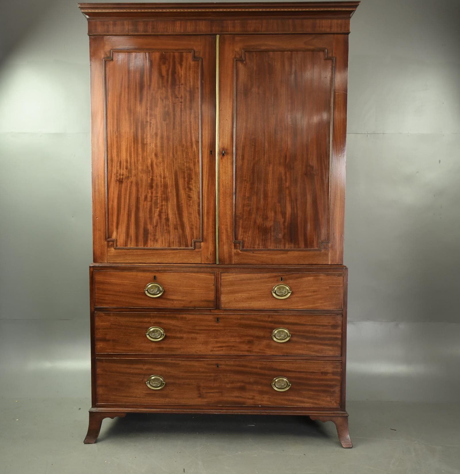 Fine quality Georgian (c.1800) mahogany Gentleman's wardrobe that has two very well figured solid mahogany doors with brass astragal, there is a single key supplied. It has a single full width hanging rail to the top providing ample depth for modern hangers, below this there are two small over two large drawers, that are oak lined with fine hand dove tailed joints, they all slide nice and smooth as they should. The whole standing on elegant splay feet.
