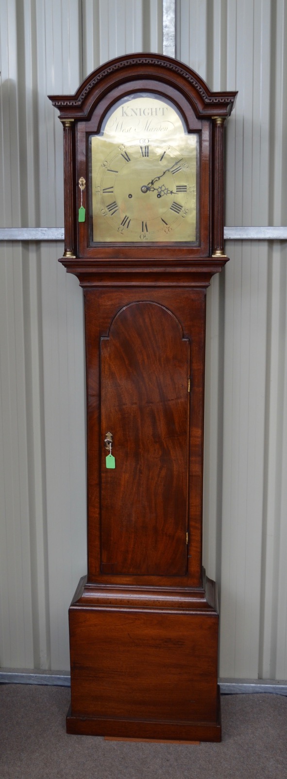 Fine Quality Georgian mahogany longcase clock signed Knight West Marden. The clock has a wonderful mahogany case with a fine grain and very good colour. The wonderful brass dial is in great condition and has an 8 day movement that strikes upon a bell on the our with hour count. The movement has been recently serviced and is keeping good time.