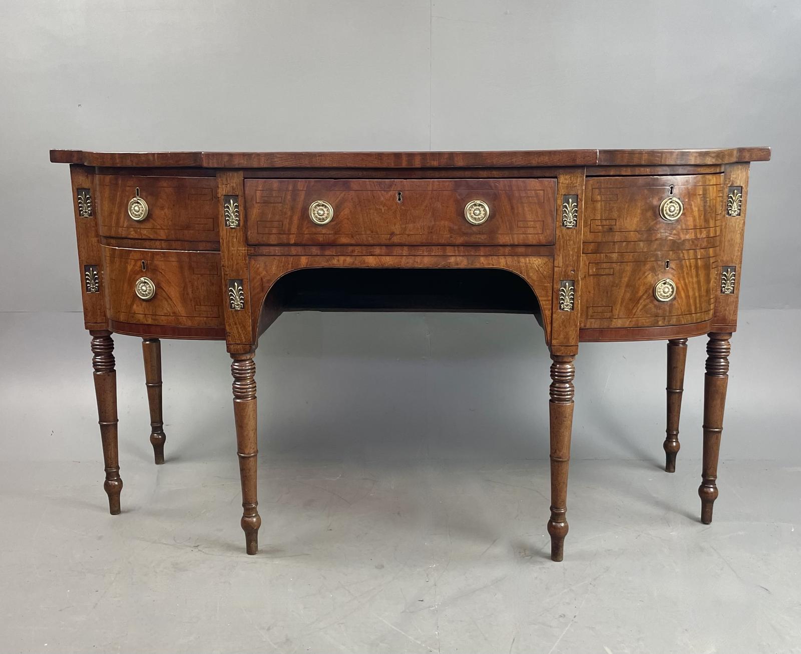 This is a fine quality Georgian (c.1800) antique flame mahogany sideboard that has a wonderful grain colour and patina, having a fine figured cross grained top with an arrangement of drawers below, the left side with two drawers, the right side with a deep cellarette drawer and single central drawer. The sideboard stands on well turned legs with unusual floral brass inlays.