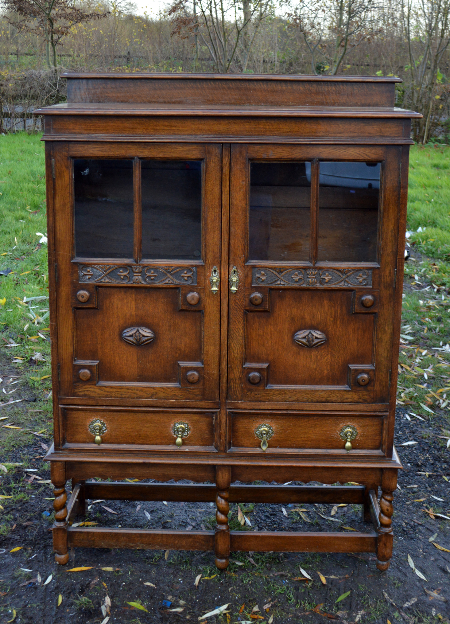 On offer for sale is this very good quality solid oak Jacobean style bookcase cabinet which is in great original condition with no damage or woodworm.