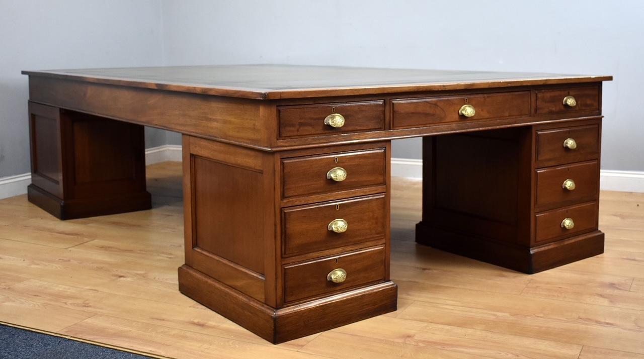 Fine quality extra large four pedestal partners desk which is very rare being of such a large size with four pedestals. All drawers slide smooth as they should with fine hand dovetailed joints. It is in great condition having been fully refurbishes with a top quality hand coloured leather insert.