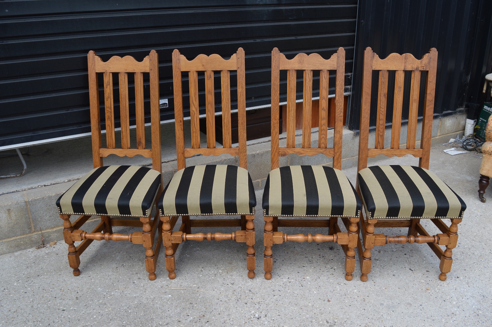 The table and chairs I have on offer is in fantastic condition with no unsightly marks to be seen. The table is made of the finest solid English oak throughout with a thick heavy planked top that is traditionally peg jointed and stands on a substantial baluster base the top is removable for transport and setting up in your home. The chairs are also constructed of the finest English oak again in very good condition with no loose joints. This furniture is of the highest standards and built to last centuries.