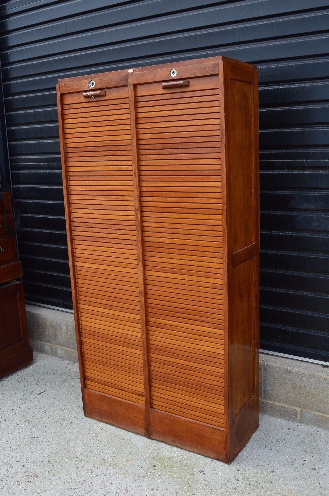 On offer for sale is this fine quality large double oak tambour front filing cabinet / bookcase. The cabinet has fully adjustable shelves with doth tambour fronts with working locks and single key remaining in very good condition woodworm free.