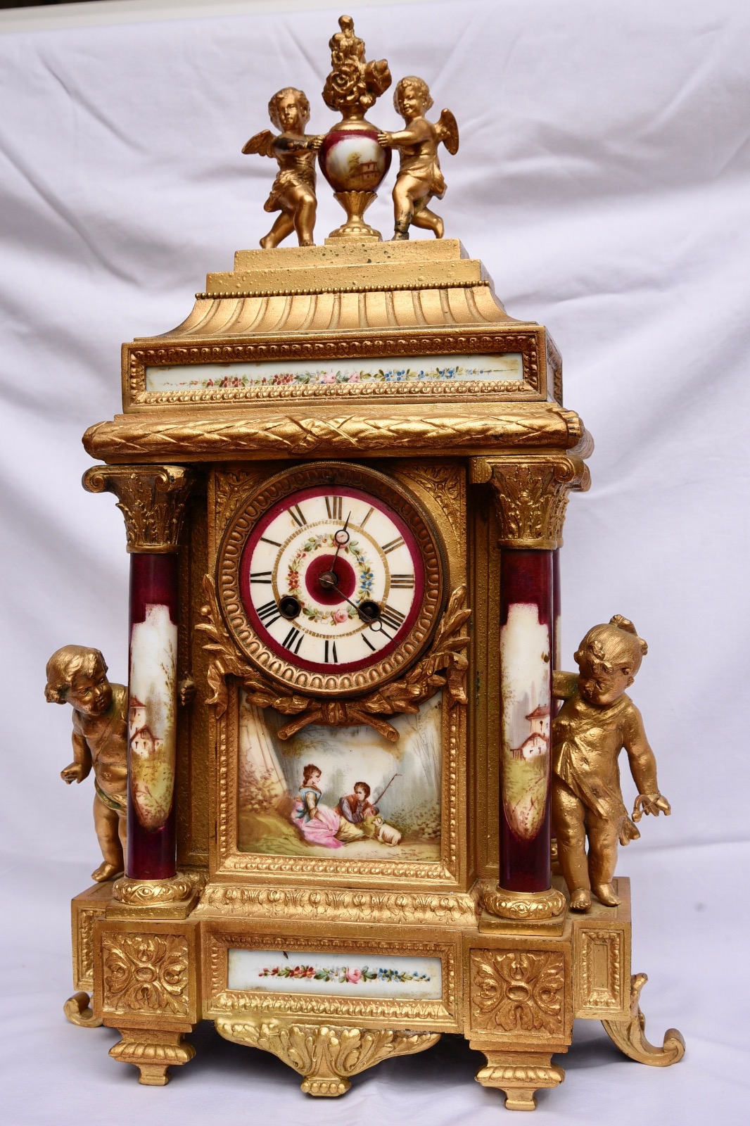Large French Gilt & Sevres Porcelain Mantle Clock