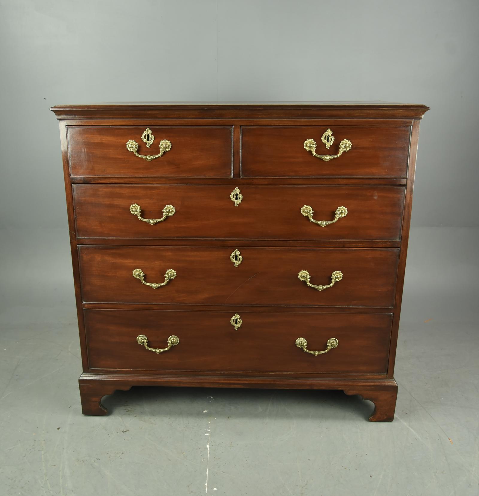 This is a good quality late Georgian antique mahogany chest of drawers which is on the larger size with a great colour and grain. The top cross banded in walnut, with two short and three wide drawers that are all solid oak lined with fine hand dovetail joints, fitted with fine quality ornate swan neck handles. All the drawers slide nice and smooth as they should.