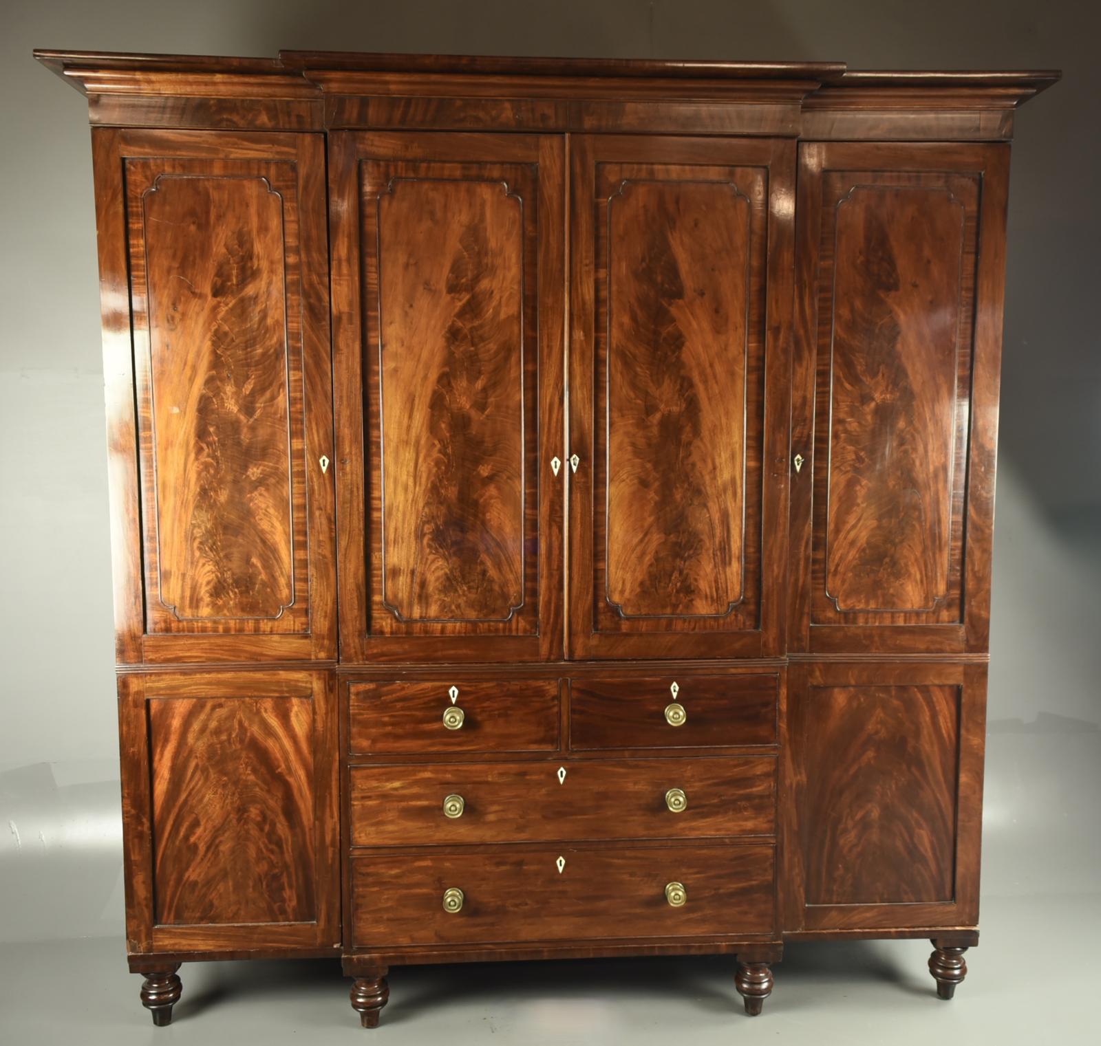 Fine quality Late Georgian mahogany compactum wardrobe that has a fully fitted centre section with slide out trays that can be removed to create additional hanging space below this there are two small over two large oak lined drawers. Flanked either side with lined hanging sections. The wardrobe has a wonderful flame mahogany grain and is a fantastic colour. There are keys for each door and top two drawers.