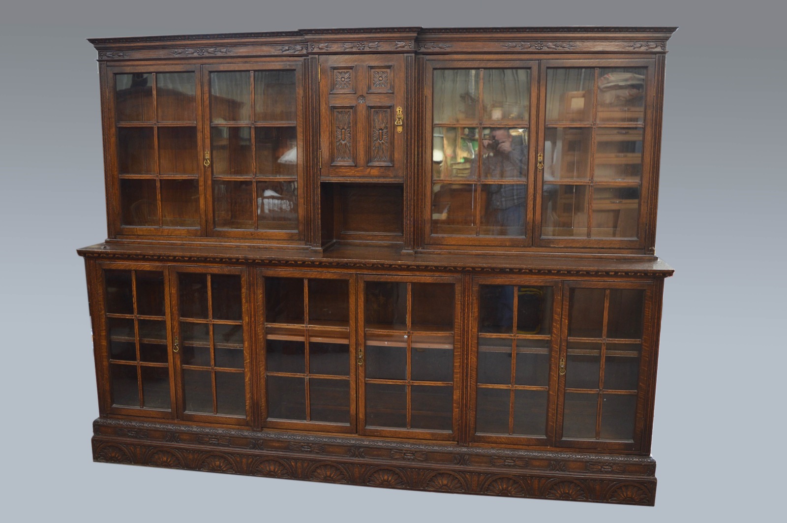 Fine quality large carved oak bookcase in very good condition and a wonderful colour with ten doors and central carved cupboard. The bookcase comes 6 sections for transport these consisting of two top bookcase sections and central cupboard section the base 6 door section plus the carved cornice and carved base There are keys for the locks.