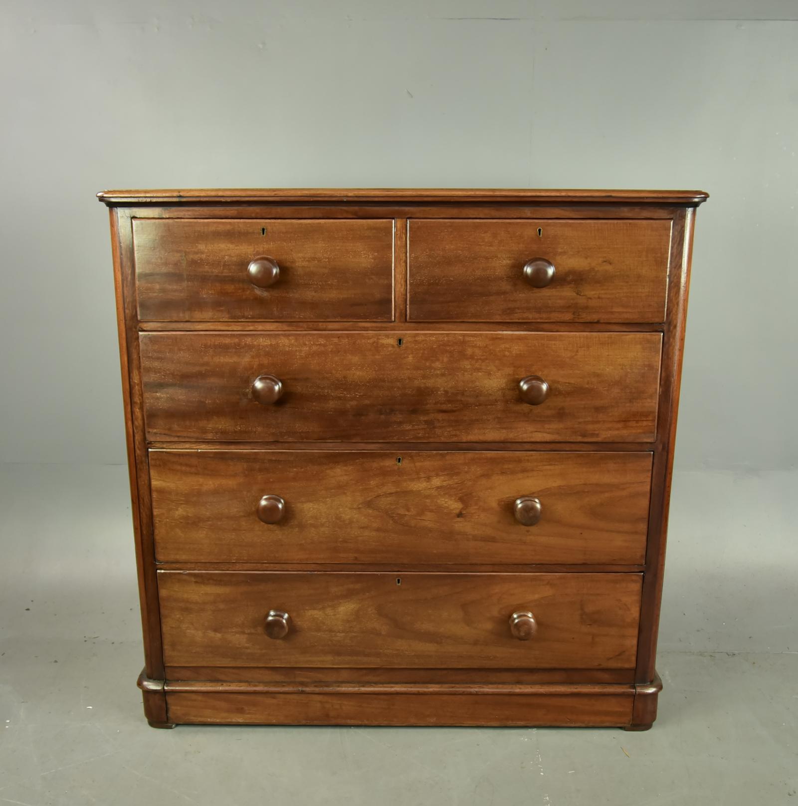 A solid mid-19th century mahogany chest with a classic two over three drawer layout. Features a warm, rich patina, turned wooden knob handles, moulded top, and plinth base.