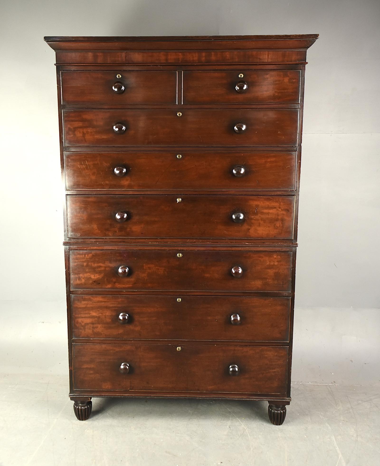 Very large good quality mid 19th Century antique mahogany chest on chest tallboy, reputedly removed from Osborn house isle of white. The chest is constructed of solid mahogany through out, consisting of two small over 6 large drawers. All drawers are solid mahogany lined with quality hand dovetail joints, they all in solid condition and retain their original knob handles and locks, there is a single key that fits all locks. This chest of drawers is huge providing a large amount of storage.