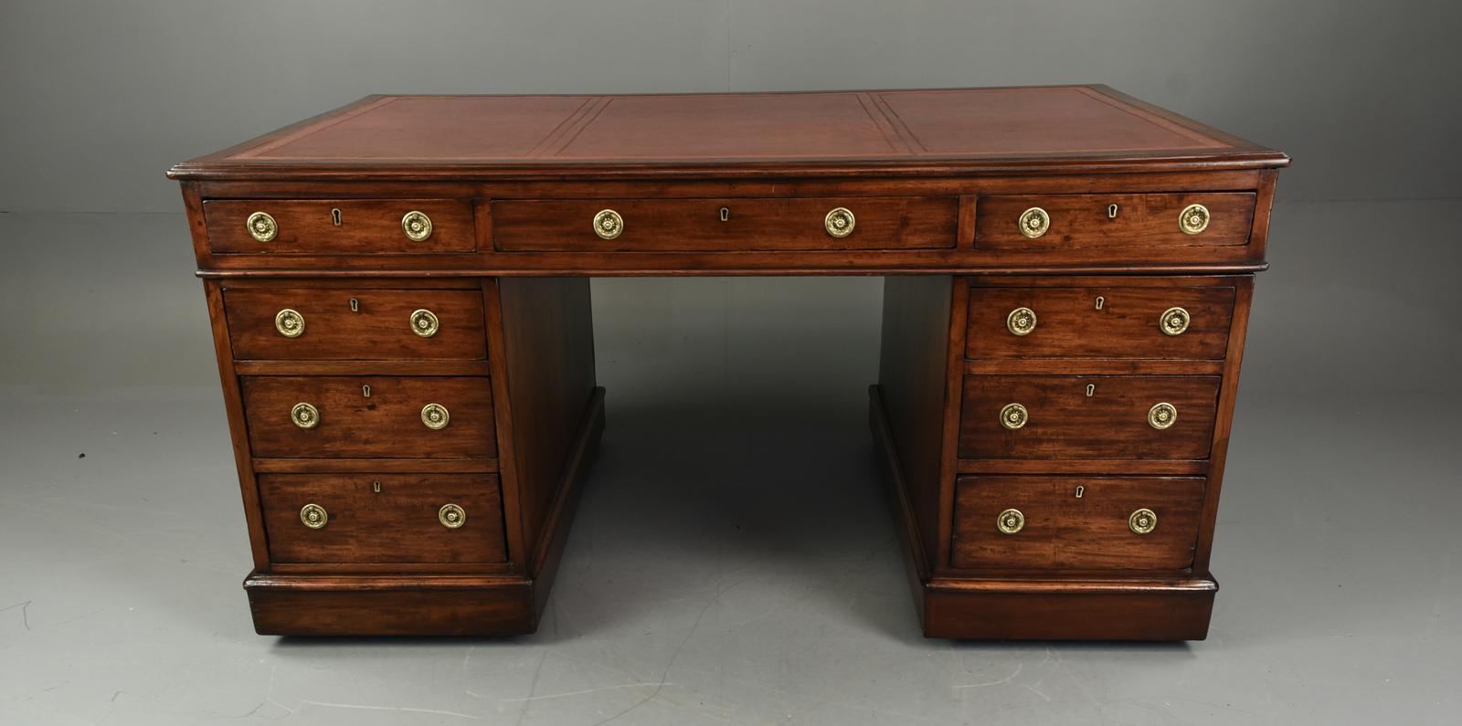 This is a large and good quality 19th Century Victorian antique figured mahogany pedestal partners desk. The rectangular moulded edge top having a top quality inset leather writing surface with blind and gold tooling. One side having 9 graduated drawers with brass ring pulls the reverse having 3 conforming drawers and 2 cupboards which open to a single shelf interiors The whole raised on off set plinth bases with hidden castors below. the desk can also be re arranged with a cupboard and bank of drawers to each side.
